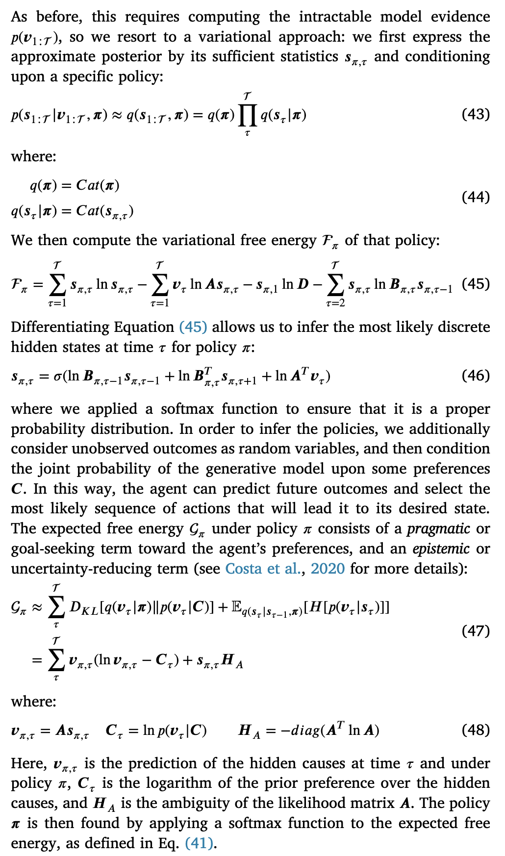 总之,计算策略 π 的后验概率转化为寻找符合 G 定义的双重目标的最佳动作。在这里,离散动作不打算作为实际的运动命令,类似于方程(7),而是作为高层次表示上的抽象动作。实际上,离散模型在主动推理中的层次结构允许在分离时间尺度的情况下进行决策,其中特定层次可以生成并推断出下层的状态和路径(de Tingu, Van de Maele, Verbelen, & Dhoedt, 2024; Friston 等人, 2024; Van de Maele, Dhoedt, Verbelen, & Pezzulo, 2024)。进一步评估长时间跨度动作的后果可以提供更高级的规划,称为复杂推理(Friston, Da Costa, Hafner, Hesp, & Parr, 2021)。计算与期望自由能的动作不同于连续模型的运动控制,后者仅最小化当前状态的自由能。