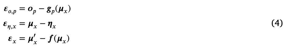通过正向运动学生成潜在配置的手部位置。这个结构与之前的模型相似,只是目标现在与手一起嵌入在隐藏状态中,并且隐藏原因与观测之间没有连接。我们可以为隐藏原因和动力学函数定义一个类似的分解,使得每个实体都有一个由特定原因(例如,手臂或目标将来会在哪里)偏向的独立动力学;然而,这在需要实体之间交互的拾取和放置操作中用处有限。因此,我们用一个函数计算一个意图状态,如下所示: