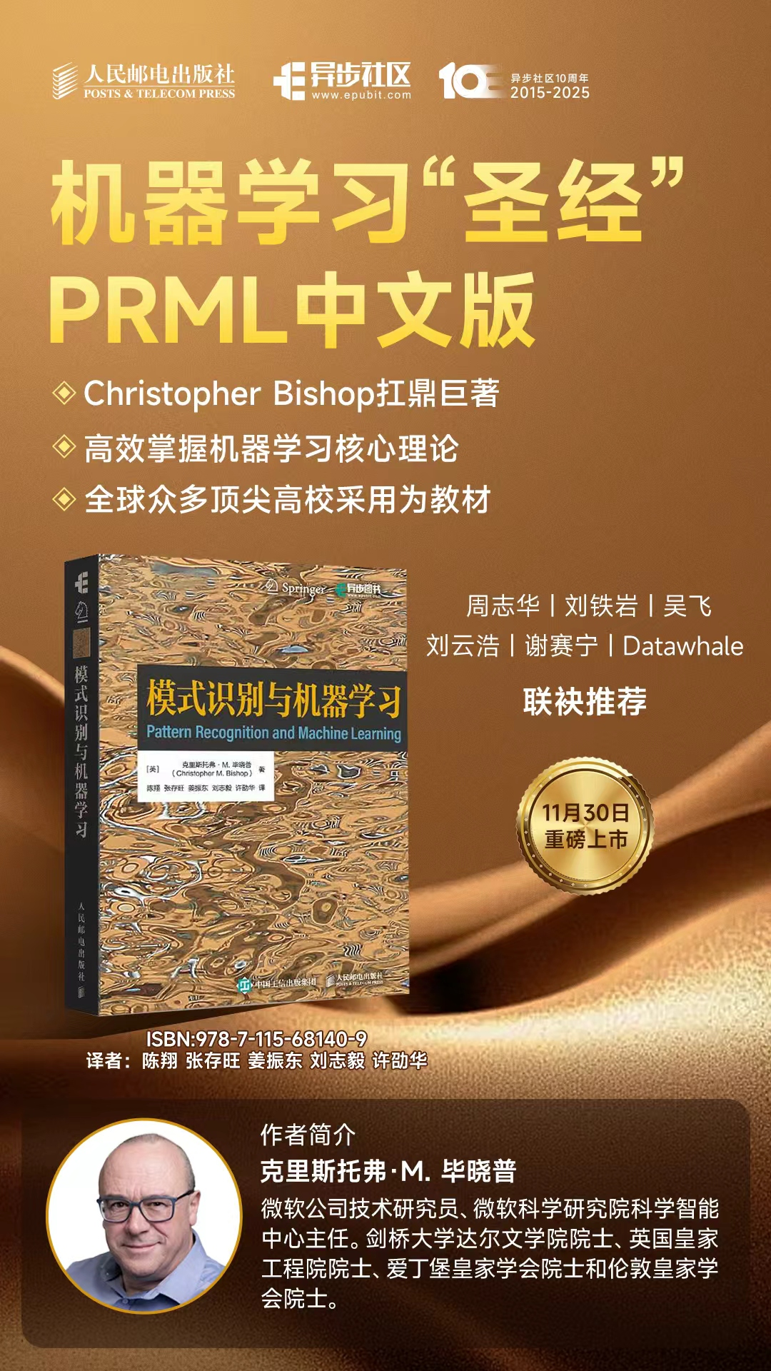 在人工智能飞速发展的今天,有一本书早在2006年就已问世,却始终屹立不倒,被全球学者奉为经典,称为机器学习的“圣经”。它就是克里斯托弗·毕晓普(Christopher M. Bishop)的《模式识别与机器学习》,简称“PRML”。该书在豆瓣保持着9.5分的惊人高分,评论区几乎清一色的五星好评。这本书被周志华、刘铁岩、吴飞、刘云浩、谢赛宁、Datawhale 联袂推荐,全球众多顶尖高校采用为教材!