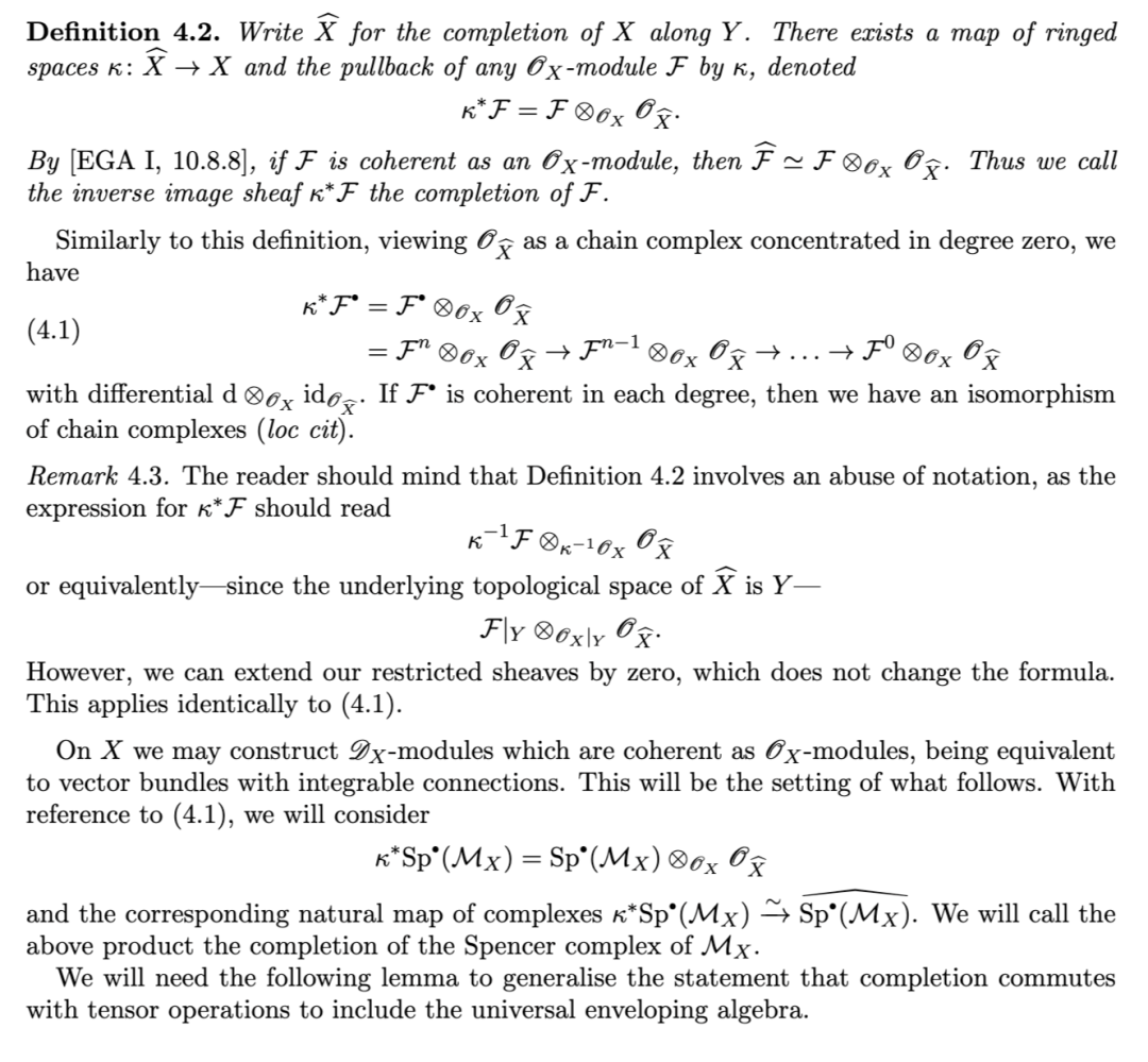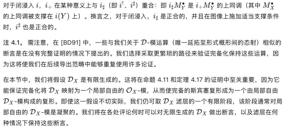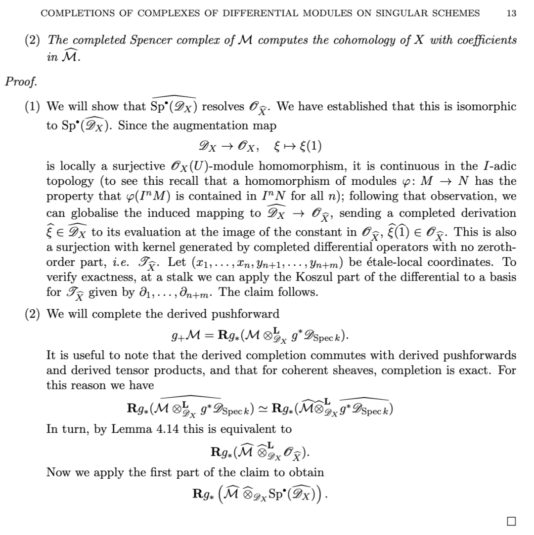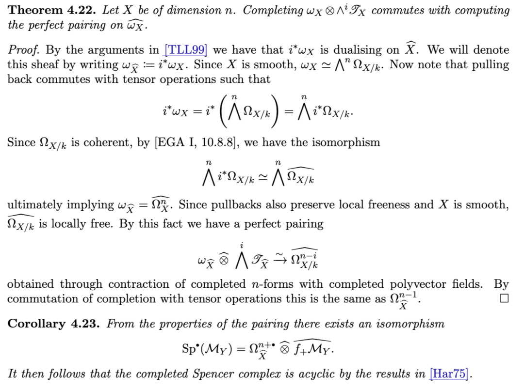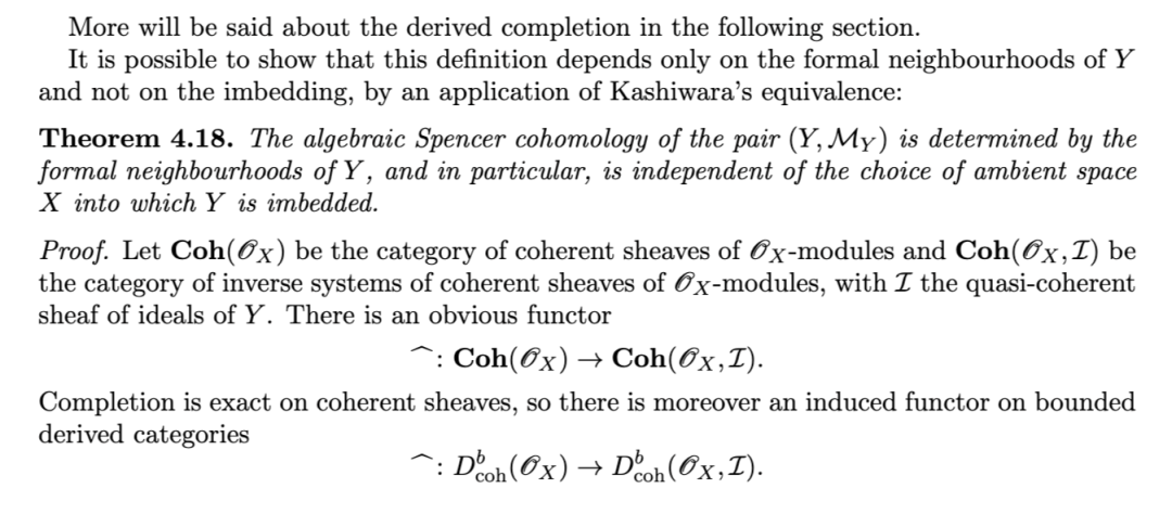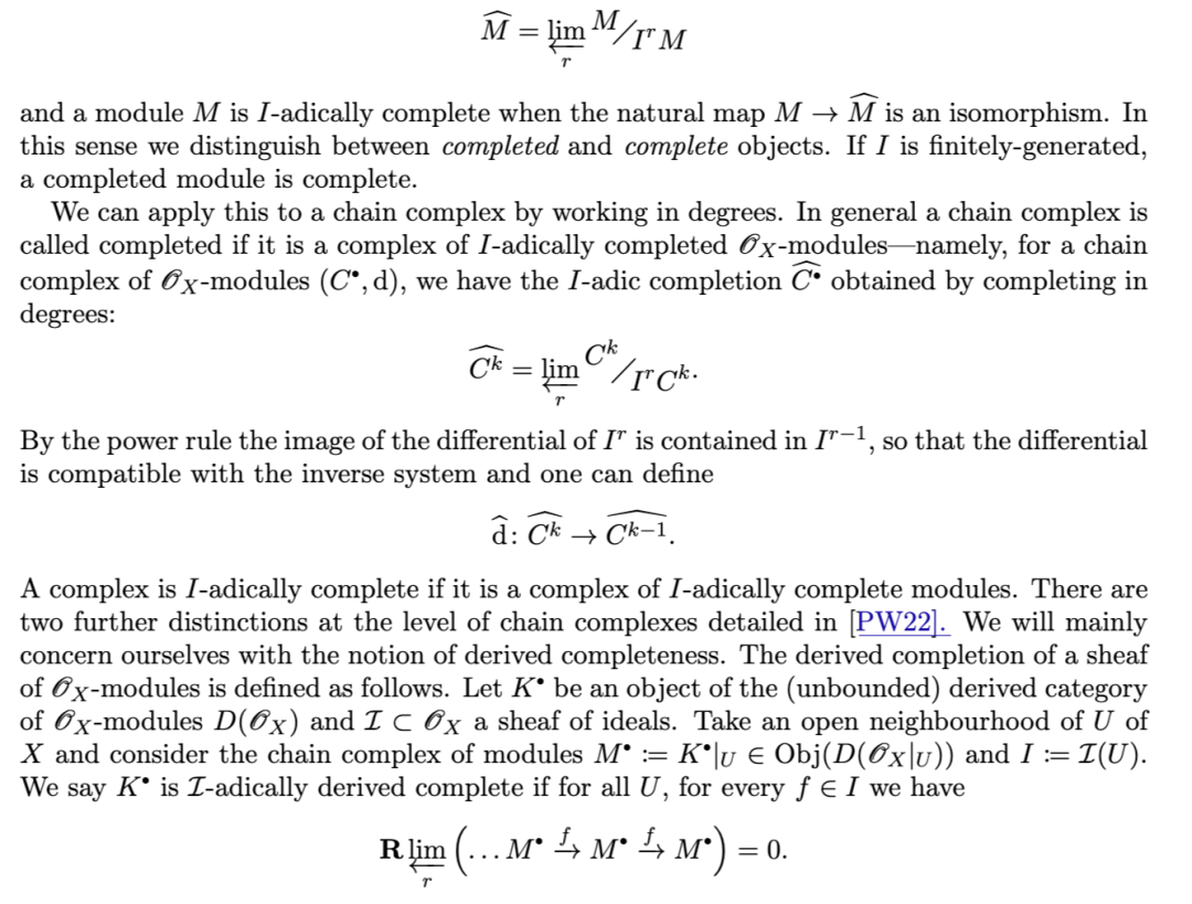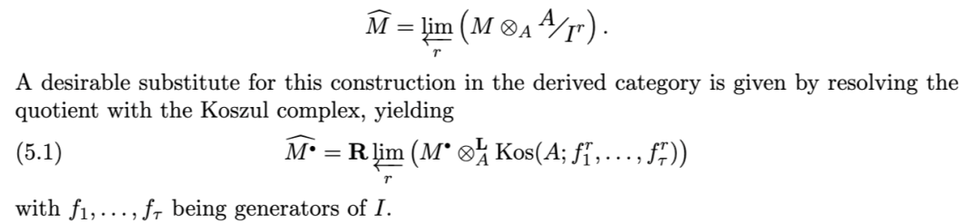 另一项有用的性质是:对有限生成理想 II 而言,沿 II 取导出完备化,通过张量–Hom 伴随关系,与关于 II 的导出局部上同调构成右伴随(反之,导出局部上同调为其左伴随)。该结果归功于 [TLL97],其中作者给出了著名的 Greenlees–May 对偶性 [GM92] 的层化(sheafification)版本。