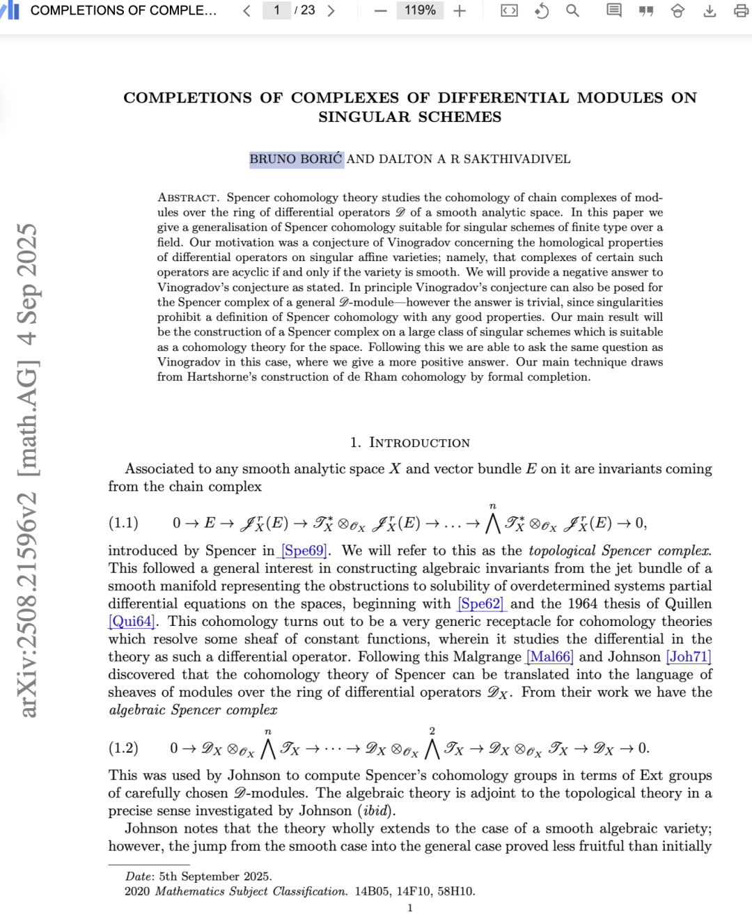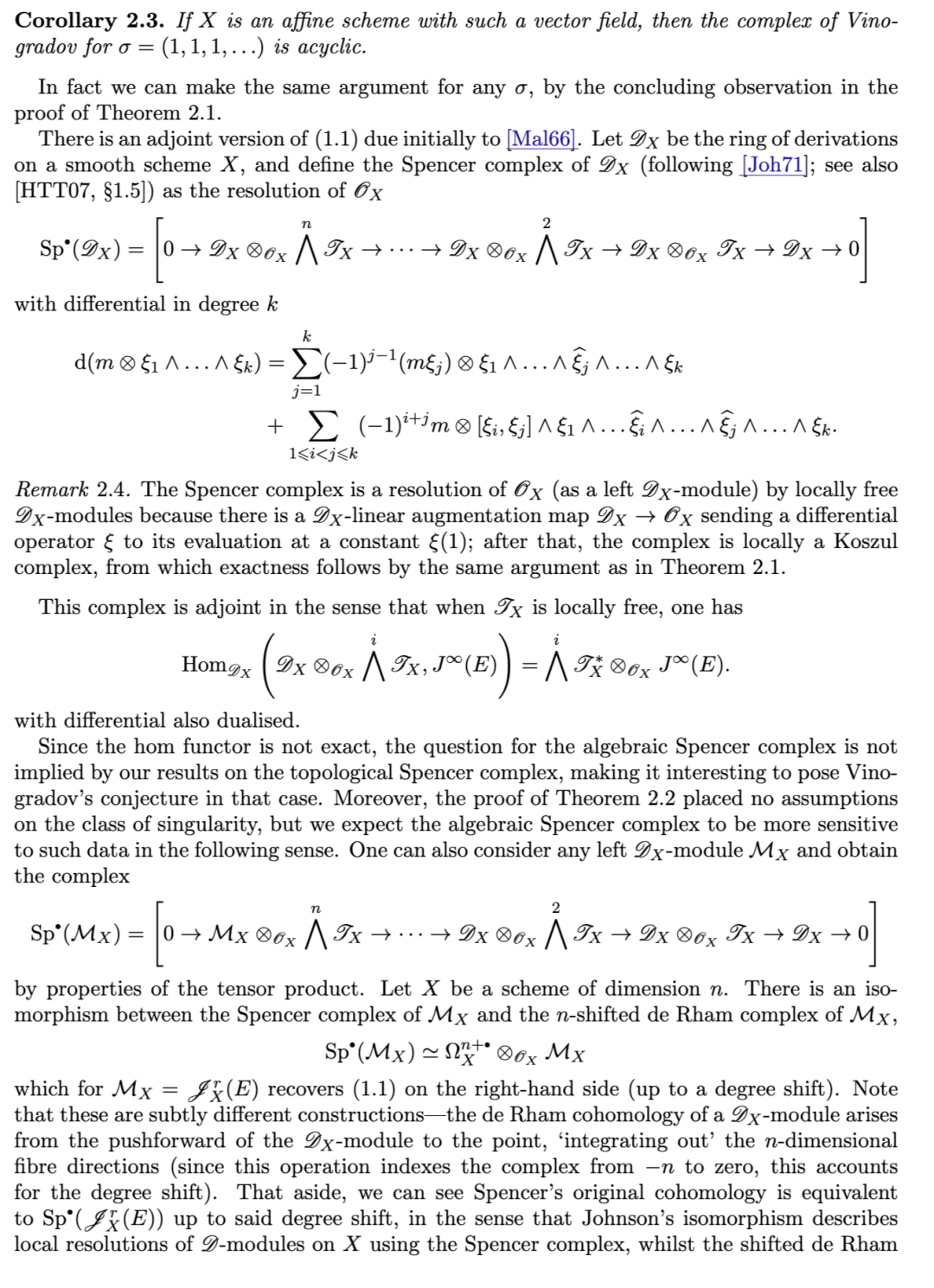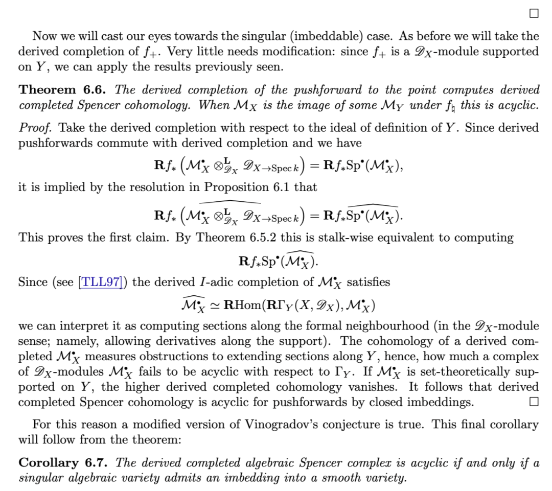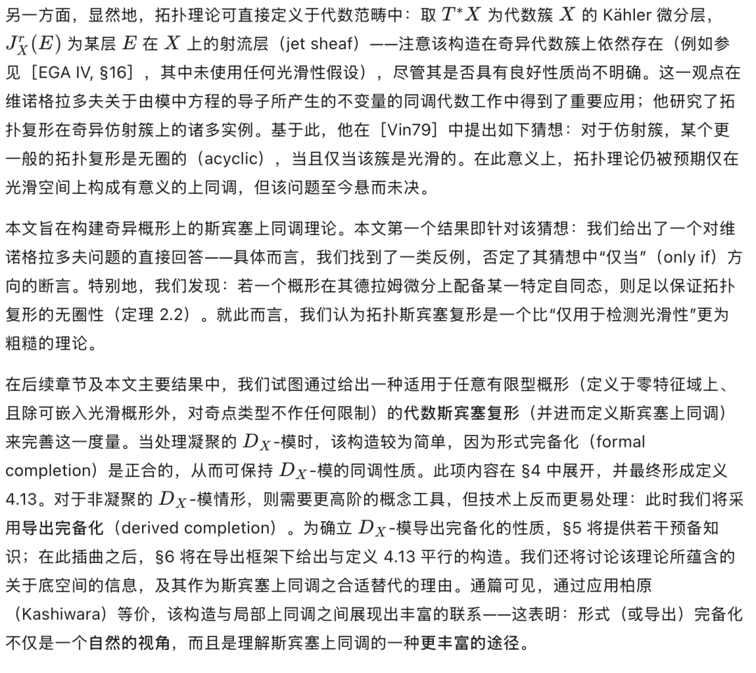 斯宾塞上同调理论研究的是光滑解析空间上的微分算子环 DD 的模链复形的上同调。本文给出了适用于域上有限型奇异概形(singular schemes of finite type over a field)的斯宾塞上同调的一般化。我们的动机源于维诺格拉多夫(Vinogradov)关于奇异仿射簇上微分算子同调性质的一个猜想:即,某些此类算子复形无圈(acyclic)当且仅当该簇是光滑的。我们将对该猜想(按其原始表述)给出否定的回答。原则上,维诺格拉多夫猜想也可针对一般 DD-模的斯宾塞复形提出——然而此时答案是平凡的,因为奇异性阻碍了具有良好性质的斯宾塞上同调的定义。本文的主要成果是:在一大类奇异概形上构造了一个适合作为空间上同调理论的斯宾塞复形。在此基础上,我们得以在该框架下重新提出维诺格拉多夫的问题,并给出一个更为肯定的回答。我们的主要技术借鉴了哈茨霍恩(Hartshorne)通过形式完备化(formal completion)构造德拉姆上同调的方法。