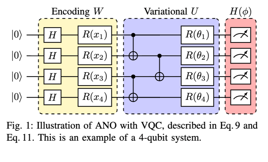 编码层 W(x) 对每个量子比特施加 Hadamard 门,接着是单量子比特旋转门 R(xᵢ),其旋转角度由输入分量 xᵢ 决定。变分层 U(θ) 由相邻量子比特之间的纠缠 CNOT 门以及具有可学习参数 θᵢ 的局部旋转门 R(θᵢ) 构成。最后,通过测量可观测量 H 来获得线路的输出。