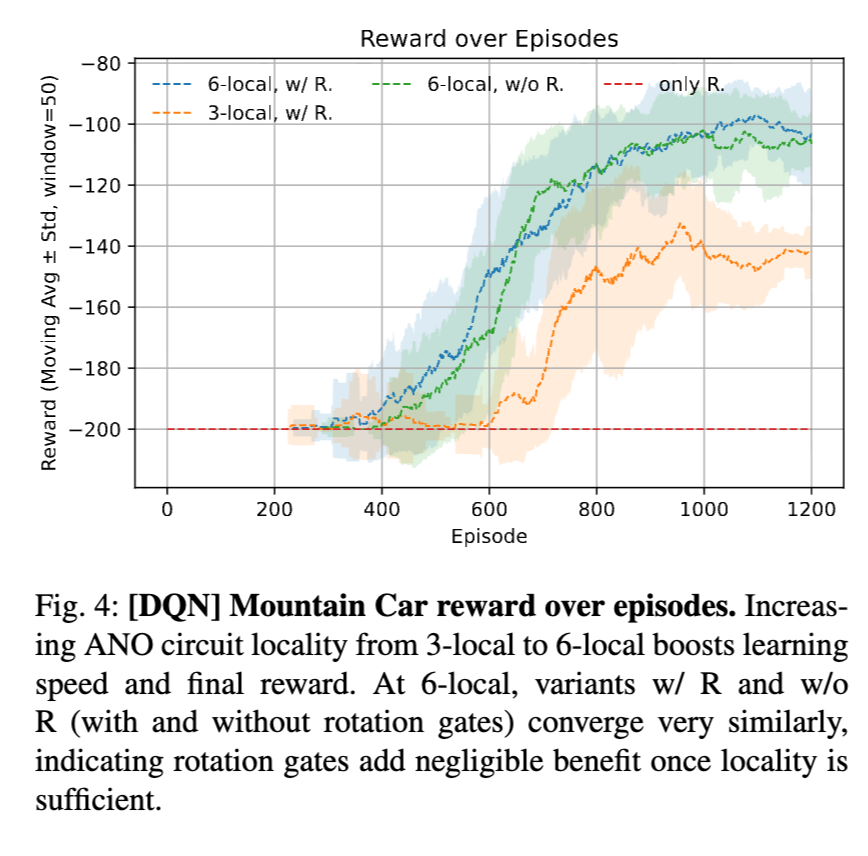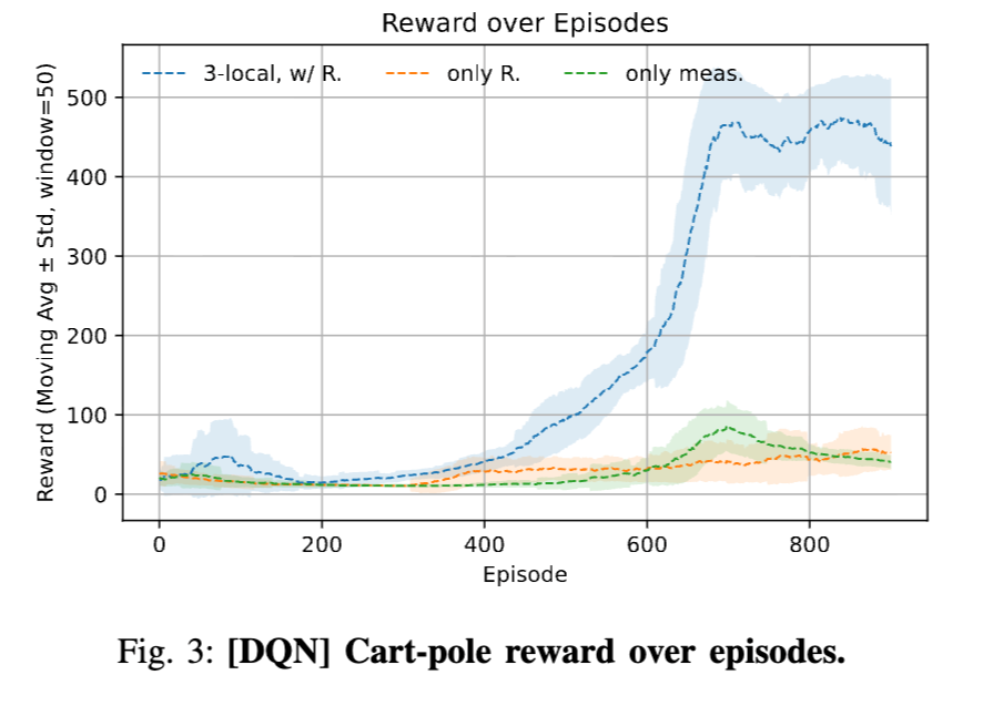 带有旋转门的 3-局域配置学习速度最快,比另外两种配置更早且更稳定地达到环境设定的 500 步上限。传统的 VQC(“仅 R.”)收敛更慢,且平均奖励更低,表现类似于仅依赖测量的变体。