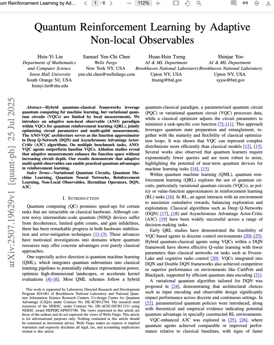 结果表明,引入自适应多量子比特测量可释放混合量子–经典智能体的潜在能力,推动我们在强化学习中迈向切实可行的量子优势。