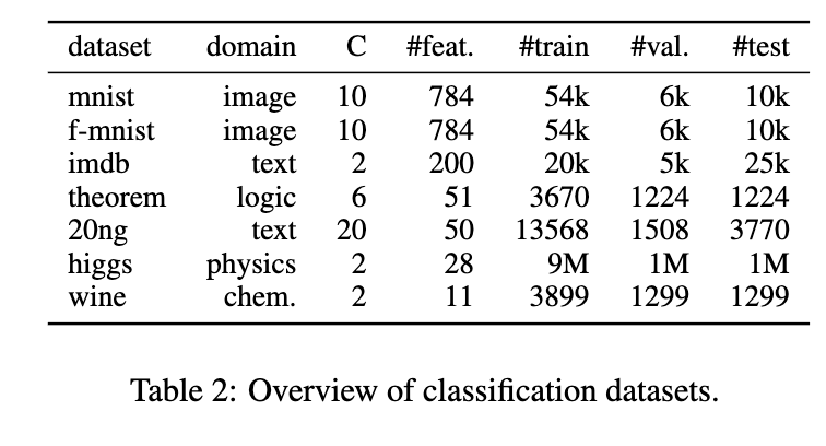 接下来,我们评估 RAT-SPNs 的判别性能。此时,其自然的竞争对手是深度神经网络——因为迄今为止,针对 SPNs 的判别式结构学习基本未被探索。为此,我们将 RAT-SPNs 应用于来自不同领域的 7 项分类任务。表 2 汇总了这些数据集的基本特性(更多细节见附录)。