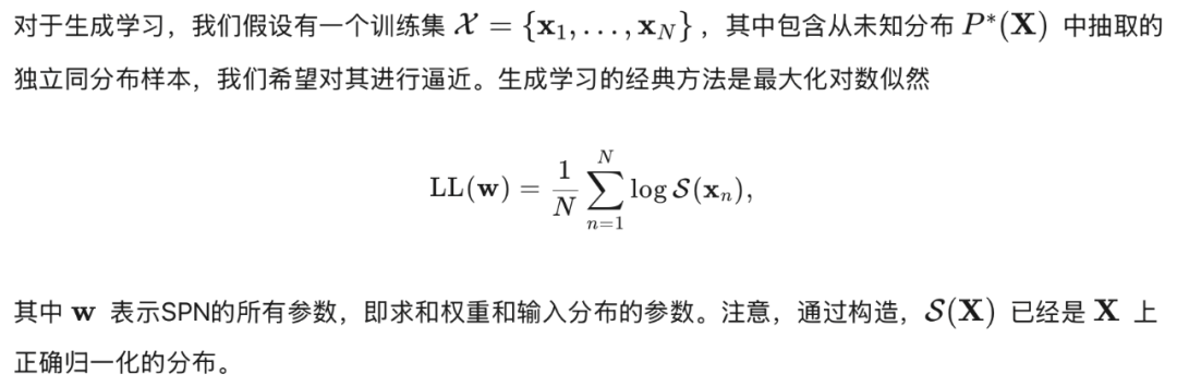 为了优化(3),我们使用标准的期望最大化(EM)算法[12],该算法最近已为SPNs重新推导[38]。EM算法快速且单调地增加似然,无需调整参数,并且可以通过简单的前向和后向传播来实现,以计算所需的期望充分统计量——详见[38]。由于这些方便的特性,我们对生成情况进行了EM算法的使用。注意,文献[54]中提出的凹-凸过程与EM算法对求和权重的更新一致,但通常与输入分布不同。