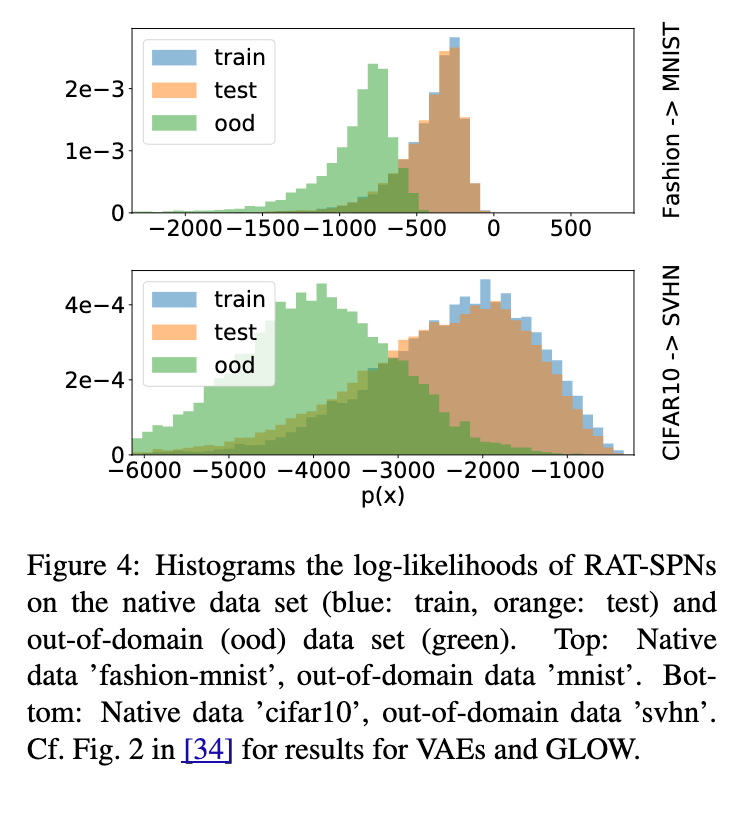 与 VAE、PixelCNN 和 GLOW 不同(参见 [34] 中对应图表),RAT-SPNs 并未赋予域外样本更高的似然,并能清晰区分正常值与异常值。这一点在 mnist 相对于 fashion-mnist 的情形中尤为明显;在另一情形(svhn 相对于 cifar10)中,svhn 的似然直方图与 cifar10 有轻微重叠,但仍可区分。无论如何,这清楚地凸显了 RAT-SPNs 在不确定性校准方面的优势——相较于当前基于神经网络的深度生成模型(后者易陷入“似然幻象”),RAT-SPNs 能更可靠地表达不确定性。