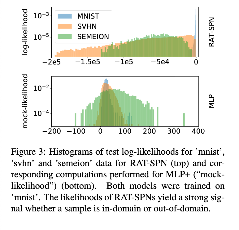 后训练的 RAT-SPN 在接收 mnist 测试数据(域内)、svhn 测试数据(域外)及 semeion 数据(域外)时,输入对数概率的直方图。似然直方图提供了强有力的信号,可清晰区分样本是否来自域内或域外。事实上,mnist 与 semeion 的样本可被完美区分——semeion 中最高输入概率仍低于 mnist 中最低输入概率。而 mnist 与 svhn 的样本重叠率不足1%。因此,RAT-SPNs(及其他支持精确联合概率建模的模型)额外提供了一条“通信通道”,可告知用户何时应信任其预测结果。