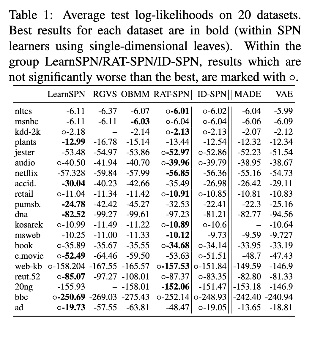 表 1 给出了平均测试对数似然结果(数值越高越好)。对每个数据集,我们将直接竞品中最高值加粗,并进一步在 RAT-SPN、LearnSPN 与 ID-SPN 三者间进行统计显著性检验(双样本 t 检验,p=0.05 ):若某方法结果不显著差于最优者,则标注符号 ◦。