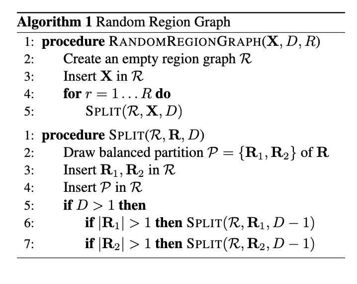 本文旨在探究:SPN 中的结构学习究竟有多重要?为此,我们提出一种简单且可扩展的方法,用以构建随机且张量化(tensorized)的 SPN(RAT-SPNs),从而完全避免结构学习的必要性:首先构建一个随机区域图(region graph)[13, 36],随后在其中填充 SPN 节点的张量阵列。该策略本质上对应一种随机分层张量分解 [48],生成的 SPN 稀疏性较低。RAT-SPNs 可良好适配 TensorFlow [1] 等深度学习框架,参数规模可扩展至百万级,并能自动利用 GPU 并行加速。