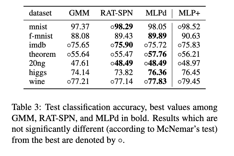 20ng 的正确样本数完全一致); 综上,RAT-SPNs 在判别式训练下可提供可靠的分类性能。此前大多数关于 SPNs 判别式参数估计的工作均针对图像任务,依赖强大预提取特征 [19] 或专用结构 [48, 3]。而我们的结果首次表明:使用完全随机结构、端到端训练的 SPNs 同样有效——不仅将 SPN 训练扩展至深度神经网络的规模,且性能可与之竞争。