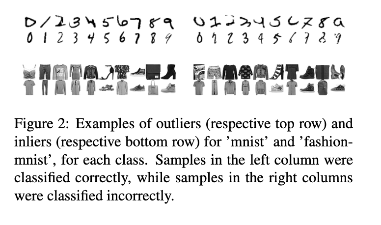 尽管结果是定性的,但仍颇具启发性:对于 mnist,可直观确认异常数字确实形态奇特——无论是被正确还是错误分类的样本。例如,在“异常值/错误分类”组中,数字“0”和“3”似乎在预处理时被截断,“6”则对人类而言也难以辨认。而在“正常值/错误分类”组中,样本本身较为模糊,这似乎是导致误分类的主要原因。这一点体现在该组样本的预测不确定性(类别分布的交叉熵)最高,且在10个样本中有8个,正确类别排在第二高概率位置(见附录)。fashion-mnist 的结果与此类似。