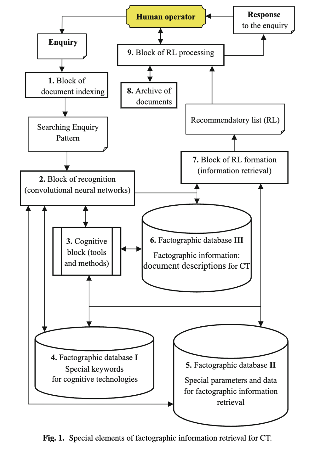 4 结果 研究发现,面向认知技术(CT)的事实型信息检索特殊要素(SEFIR)由九个模块构成,例如:三个事实型数据库、模块2(识别模块,采用CNN)、模块3(认知模块,含工具与方法)、模块9(推荐列表处理模块)及其他模块。文中提出了事实型信息检索的重要关键词,并建议将其存储于事实型数据库中。所提出的系统可应用于多个领域,主要应用场景是在大规模文本信息中,基于检索模式进行数据处理与查找;例如,在需要全文检索的各类应用中——如司法鉴定、法学及其他需处理海量文本信息的领域。通过使用不同的检索模式并配置相应算法,用户可显著缩短在特定领域内查找所需事实数据的时间。需指出的是,本文提出的面向认知技术的事实型信息检索特殊要素,对认知技术领域的研究者及事实型信息系统开发者而言具有重要参考价值。