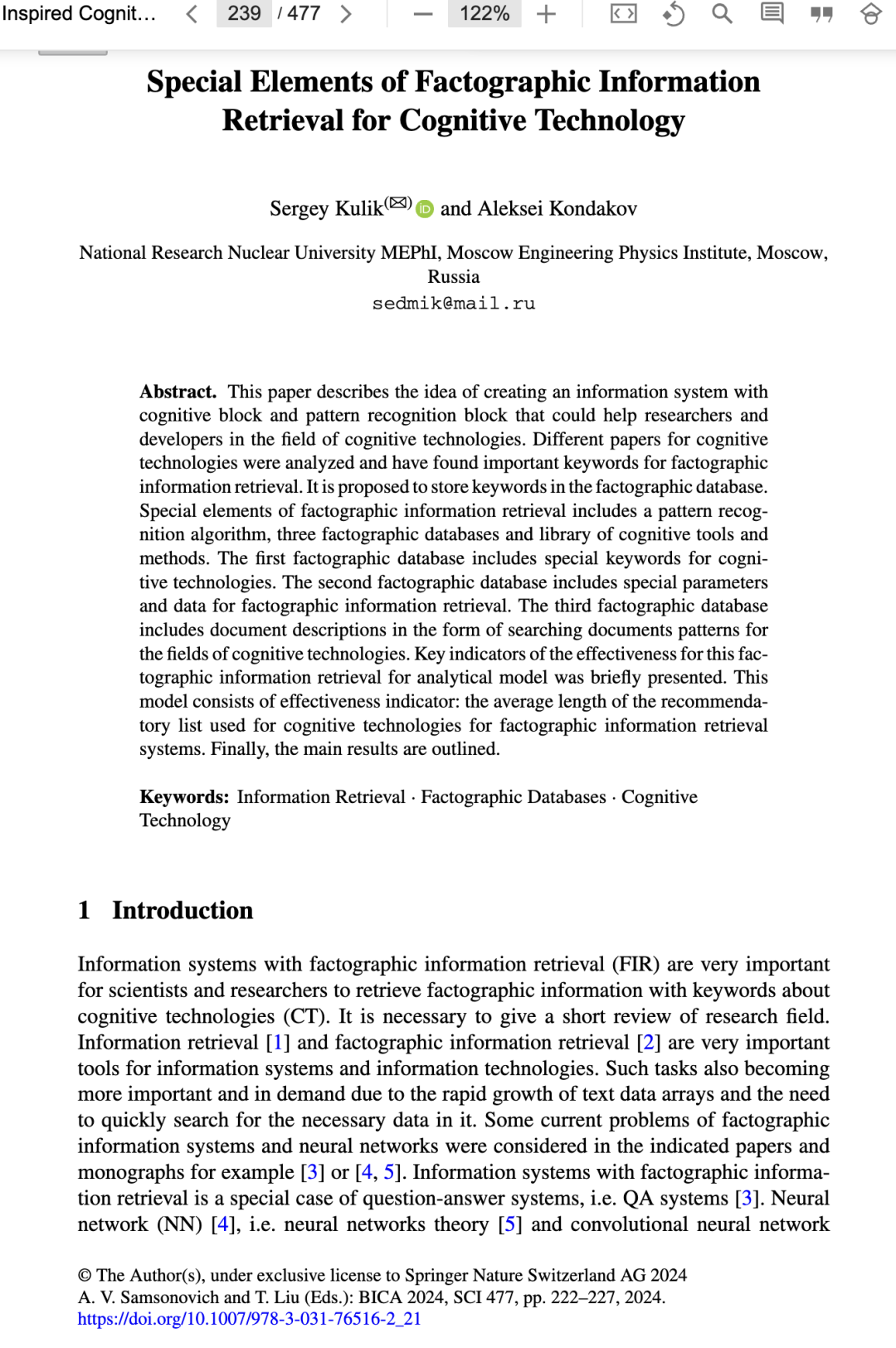 本文阐述了一种构建信息系统的构想,该系统包含认知模块与模式识别模块,可为认知技术领域的研究者与开发者提供支持。通过分析多篇认知技术相关文献,提取出事实型信息检索的关键术语,并建议将其存储于事实型数据库中。该事实型信息检索的特殊要素包括:一种模式识别算法、三个事实型数据库,以及一个认知工具与方法库。其中,第一个数据库收录认知技术领域的专用关键词;第二个数据库收录事实型信息检索所需的专用参数与数据;第三个数据库则以“检索文档模式”的形式存储认知技术领域文献的描述信息。文中简要介绍了该事实型信息检索在分析模型中的关键有效性指标:即推荐列表的平均长度——该指标用于评估面向认知技术的事实型信息检索系统的效能。最后,概述了主要研究成果。