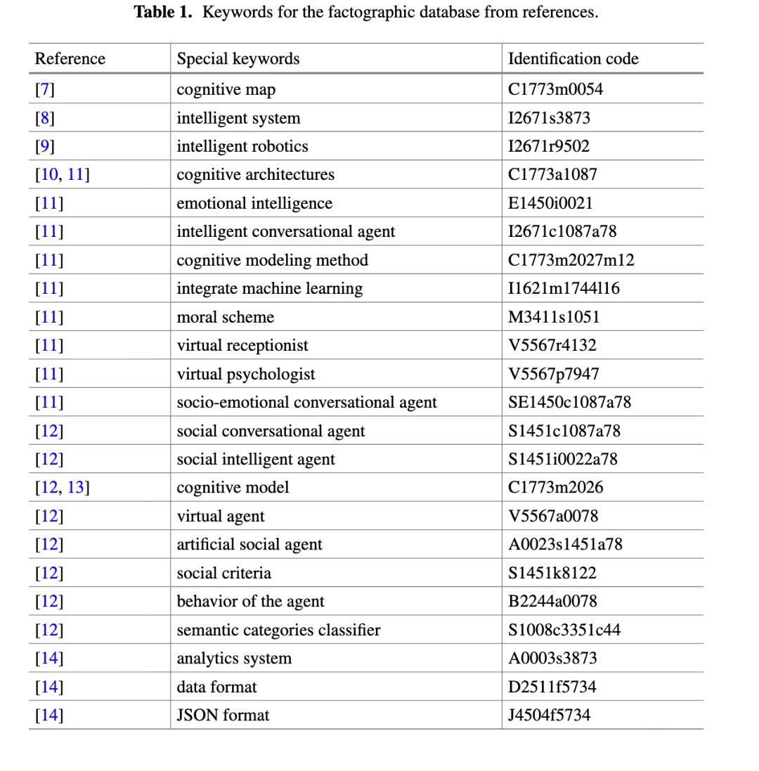 本文分析了多篇认知技术(CT)相关文献,从中提取出事实型信息检索(FIR)的重要关键词,并建议将这些关键词存储于事实型数据库中。表1展示了部分此类关键词(即科技文献的特殊特征)示例;表1中的关键词被存入事实型数据库I。