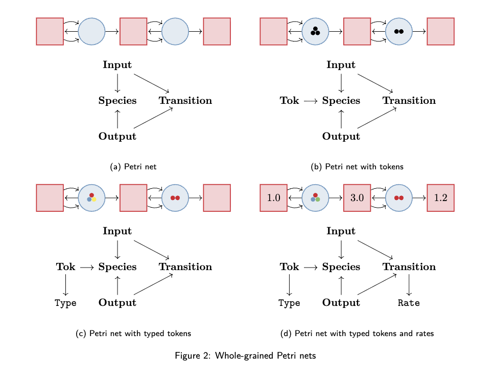 示例 2:一个细粒度 Petri 网由物种(species)、变迁(transitions)、到变迁的输入(inputs to transitions)以及从变迁的输出(outputs from transitions)组成 [13]。我们在图 2 中可视化 Petri 网,按照传统,物种用圆圈表示,变迁用方块表示。Petri 网常通过增加一组“标记”(tokens)来扩展,每个物种对应一组标记。这可通过在模式中添加一个新对象 Tok 并引入从标记到物种的映射来实现——这种用映射表示多对一关系的技巧,在使用关系代数建模数据时十分常见。请注意,细粒度 Petri 网的模式与有向二分图(directed bipartite graph)的模式是同构的,我们将在示例 6 中再次讨论这一点。