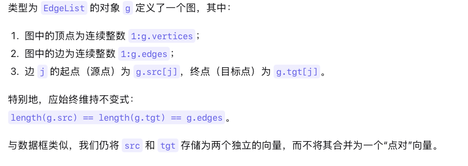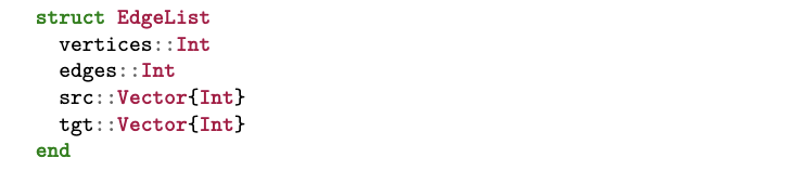 正如引言中所述,我们最终希望将图视为两个相互关联的数据框。然而,在转向这一策略之前,我们先考察图的典型实现方式。在 Julia 中实现图的最简单方法之一,或许是采用边列表(edge list)数据结构: