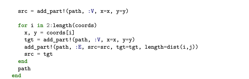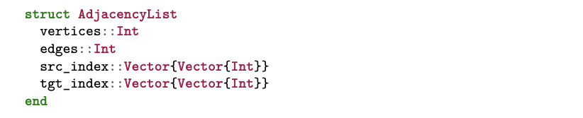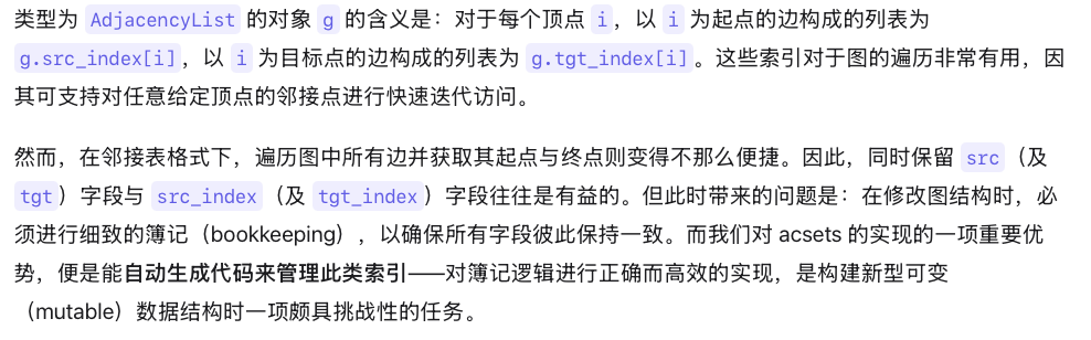 在上述代码中,对 incident 的调用返回从给定顶点 v 出发的所有出边列表——该操作利用了 acset 为态射 src 所维护的索引;随后对 subpart 的调用则给出所有由 v 指向的邻接顶点列表。这种数据访问模式在循环中被反复使用。相比之下,仅提供高层、基于查询访问接口的关系型数据库,在处理图算法(包括诸多高度迭代或递归的搜索算法)时往往表现不佳[7]。