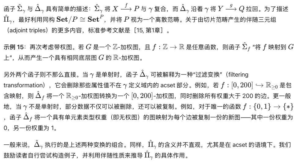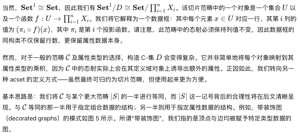 上的 acset 范畴之间还存在一个几何态射(geometric morphism)。因此,从抽象意义上讲,acset 范畴的重要性质由上述构造决定并已被充分认知;主要创新在于实现这些性质所带来的诸多实用应用。第 5 节的大部分内容将致力于展示预层范畴切片范畴的性质如何转化为设计与实现软件的实际能力。
