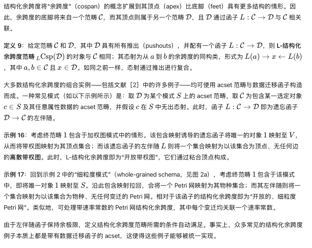 acset 常与结构化余跨度(structured cospans)结合使用,后者是由 Baez 与 Courser [2]提出的一种用于开放系统的形式化方法,建立在 Fong 的装饰余跨度(decorated cospans)[9]基础之上。结构化余跨度的范畴是对余跨度范畴的推广,下面我们回顾其定义。