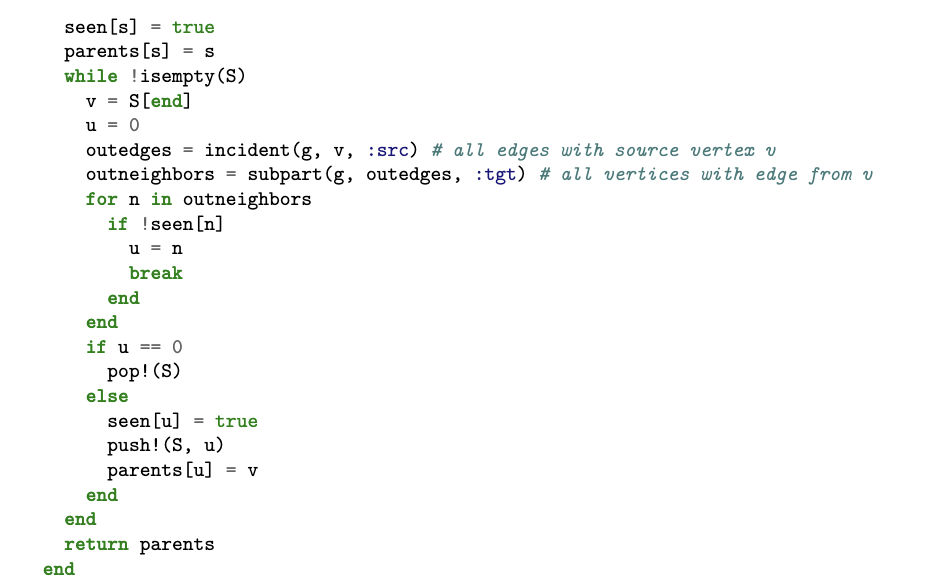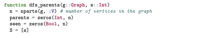 下面我们展示如何利用 acset 的底层接口编写高性能算法。作为示例,我们实现图上的深度优先搜索(DFS)。以下代码以顶点 s 为起点,对图 g 进行深度优先遍历,并返回一个父顶点数组(parent),其索引为顶点编号。