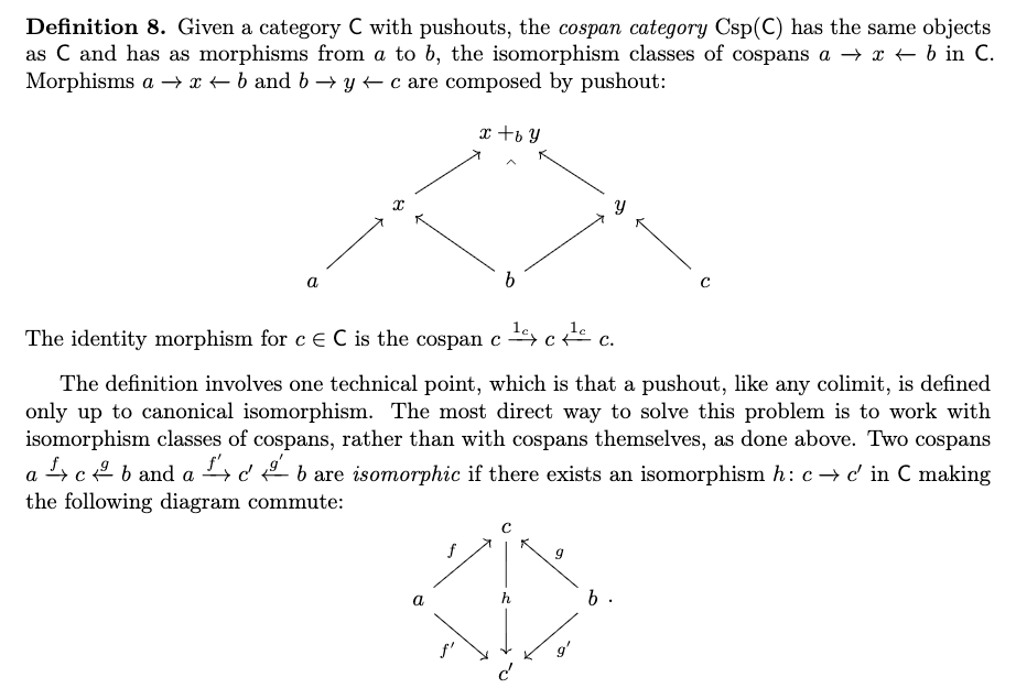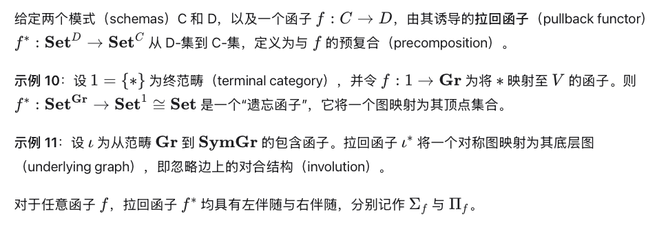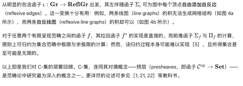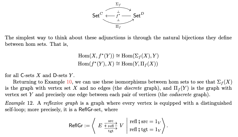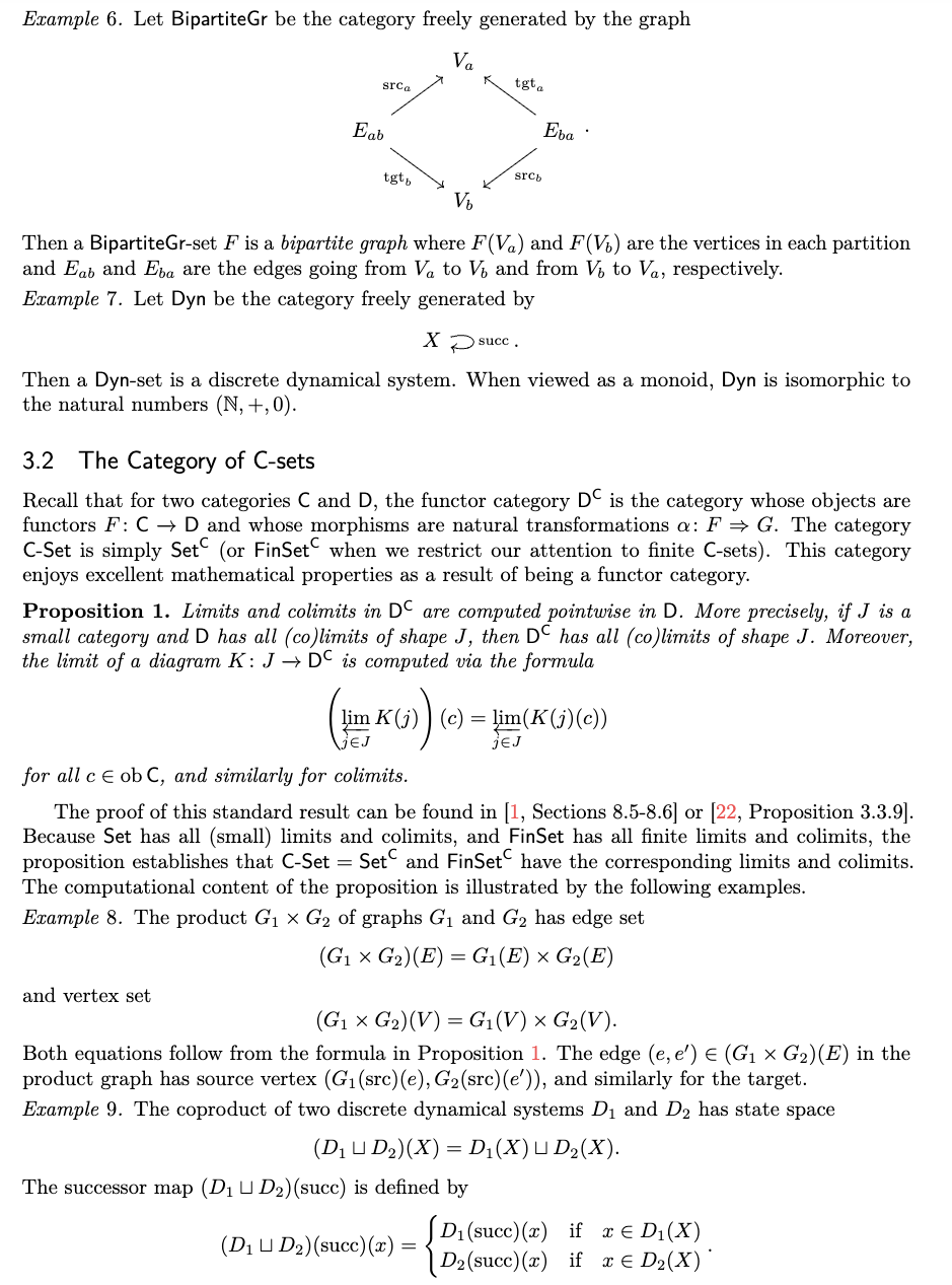 我们关注极限(limits)与余极限(colimits),是因为 C-集的应用通常涉及可通过极限或余极限表达的操作;我们将在后文看到,能够计算推出(pushouts)对于组合带结构的余跨度(structured cospans)至关重要。上述逐点公式(pointwise formula)导出了一种通用于函子范畴中计算极限与余极限的通用算法,我们已将其应用于有限 C-集的实现中。