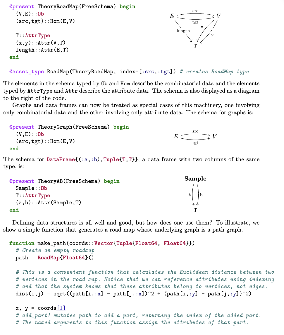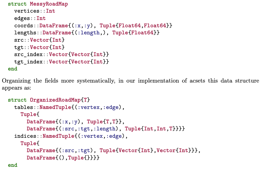 在 Catlab 的实现中,我们通过撰写模式(schema)的形式化规范,并将其传入一个函数,由该函数程序化地生成对应 acset 的数据结构,从而自动生成类似于 OrganizedRoadMap 的数据类型: