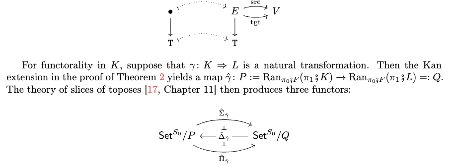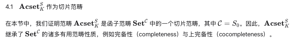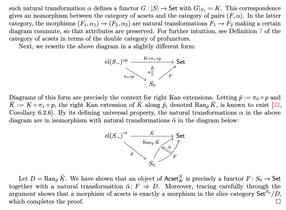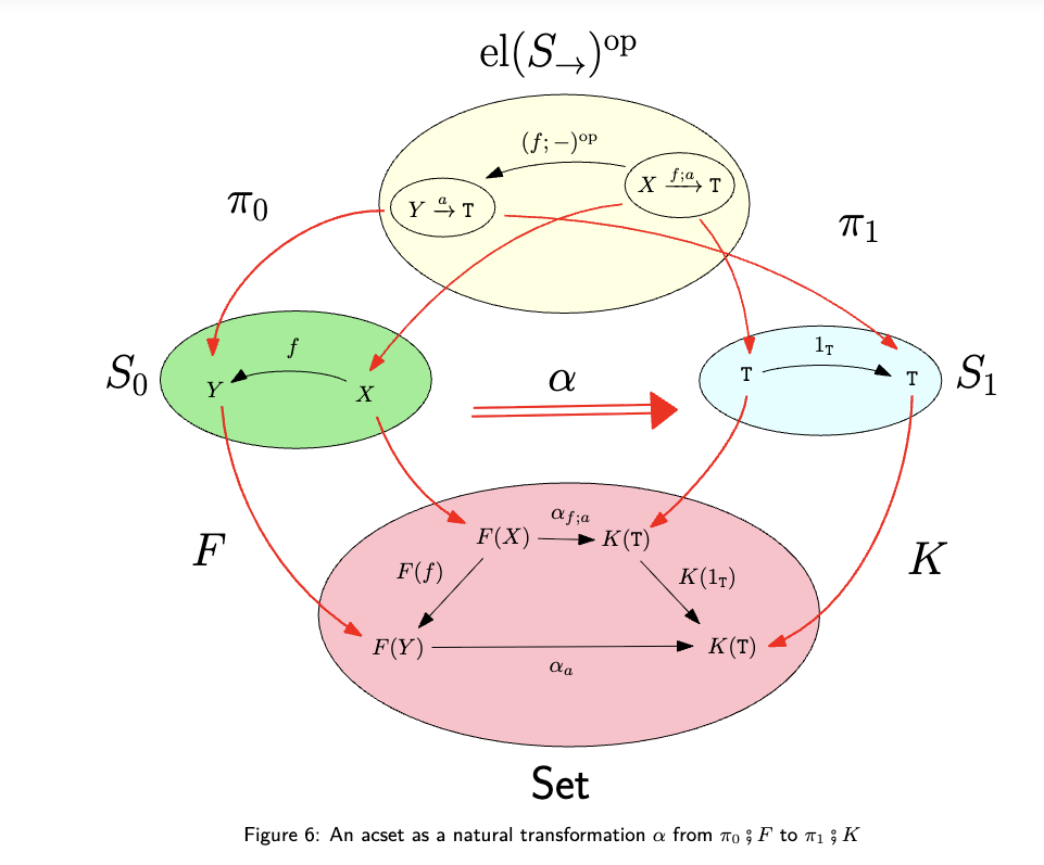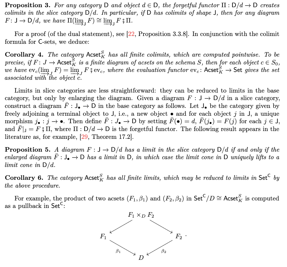 事实上,了解“acset 的范畴是预层范畴的一个切片范畴”这一点很有用,因为这类范畴具有许多理想的性质。由于预层范畴是初等拓扑斯(elementary toposes),而拓扑斯的切片范畴仍是拓扑斯(“拓扑斯基本定理”[17, Theorem 17.4]),因此 acset 的范畴本身也是一个拓扑斯。特别地,所有有限极限与余极限均存在,并可通过已知公式计算。此外,在