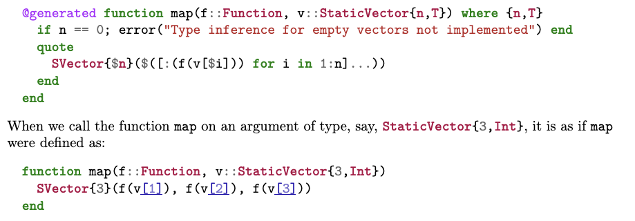 在诸如 StaticArrays.jl 等对静态尺寸向量的完整实现中,性能提升的很大一部分源于静态向量被分配在栈上而非堆上;而循环展开则使得通用地支持任意尺寸的静态向量也能在性能上媲美那些为特定尺寸(如 2D 或 3D)硬编码优化的代码。例如,欧几里得几何相关软件包从此无需再为性能考虑而对二维、三维等情形单独特化处理。
