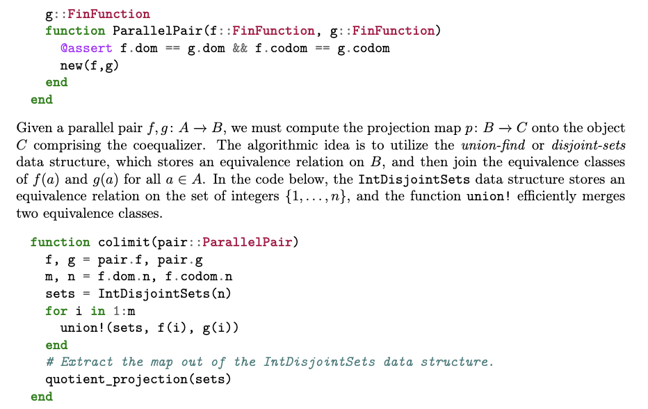 的余等化子(coequalizer)提取得到。要计算 acset 态射的余等化子,首先需要一个用于表示 acset 态射的 Julia 数据结构——即在 FinSet 中为模式中的每个对象配备一个命名元组(named tuple)。接着,给定一对平行的 acset 态射,我们对每个对象应用上述余极限函数,并依据“余极限逐点计算”的证明来构造最终的余极限 acset。需要注意的是,这还要求实现余极限的泛性质(universal property)。详细实现可参见 Catlab 的源代码。