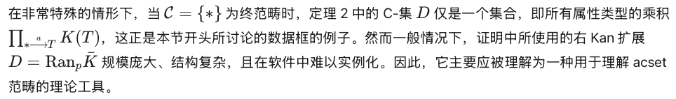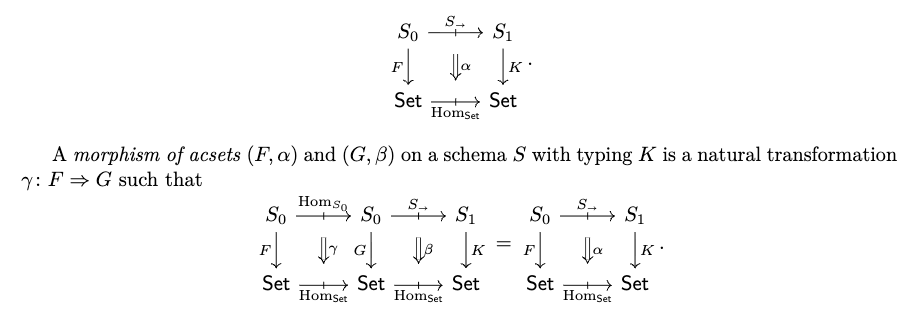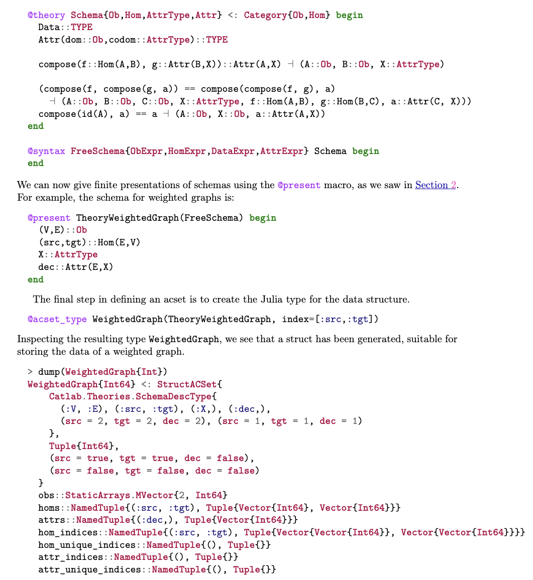我们对 acset 的定义与文献中其他带属性的范畴数据库定义密切相关[28, 25]。定义 7 是 Schultz 等人所提出的“代数数据库”[25]的一种更简洁但表达能力稍弱的变体:它用指向离散范畴的拟函子,替换了原定义中指向多类代数理论(multisorted algebraic theories)且保持积结构的代数拟函子(algebraic profunctors)。这意味着我们的数据模型不包含对属性数据的操作(例如数值加法、字符串拼接等内置代数运算);当然,这类操作仍可在普通的 Julia 代码中实现。