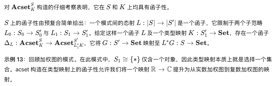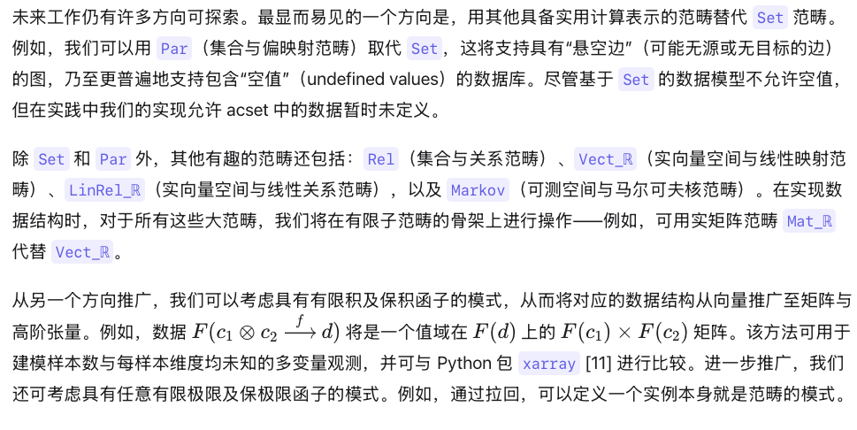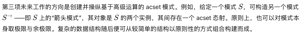 原则上,上述所有变体均可在 Julia 中采用与本文类似的方法实现。然而,要理解 acset 所支持的诸多范畴构造的含义,仍需更多理论研究。