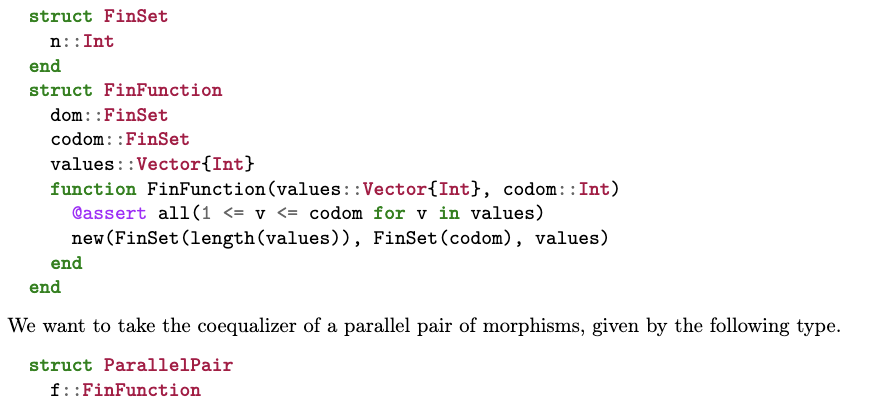 根据第 4.4 节,acset 的余极限是逐点(pointwise)计算的。因此,在讨论如何在 acset 范畴中计算余等化子之前,我们首先回顾如何在有限集合范畴中计算余等化子(参见[24, §4.6])。为便于讨论,我们采用以下数据结构来表示形如 {1,…,n} 的有限集及其间的函数——需注意,此处代码远比 Catlab 中的实际实现更简单、泛化程度更低。