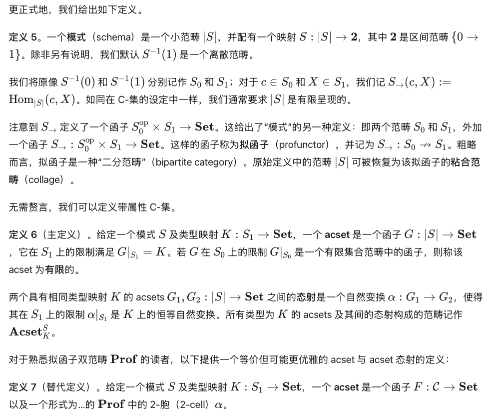 我们将此类数据结构称为 acsets(“attributed C-sets”的缩写,即“带属性的 C-集”)。我们以直接、实用的方式定义 acsets,并表明其可被重新表述为范畴代数中已被深入研究的对象;基于此数学图像,我们推导出了用于组合多个 acsets、查询 acsets 以及在不同模式的 acsets 间转换的高层操作。例如,我们可通用地计算固定模式下 acsets 的有限极限与余极限。但需强调的是,就大多数使用目的而言,使用者并不需要具备范畴论知识。