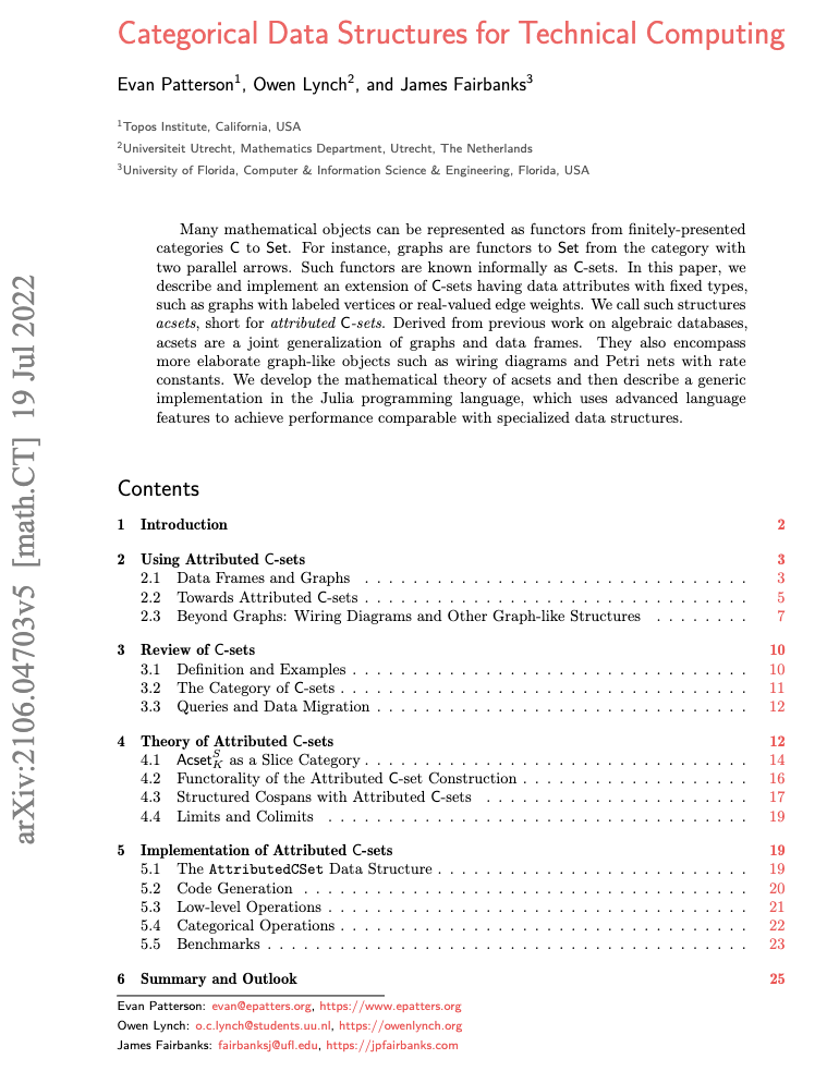 本文中,我们为将 acset 作为技术计算中的实用数据结构奠定了理论与计算基础。该方法的优势有三重:acset 为包括图与数据框在内的众多现有数据结构提供了统一的抽象;它支持关系型数据新数据结构的快速开发;且其底层范畴理论已被充分理解,从而便于实现诸如极限、余极限和函子式数据迁移等强大而通用的操作。