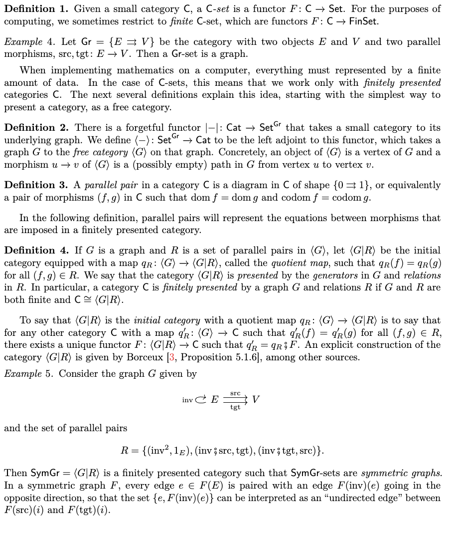 3 C-集回顾 在转向带属性 C-集(attributed C-sets)的理论之前,我们先回顾 C-集的概念——亦称范畴 CC 上的余预层(copresheaf)。在本节及下一节中,我们假定读者已熟悉范畴论的基本概念,即范畴(categories)、函子(functors)与自然变换(natural transformations)。