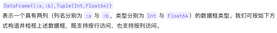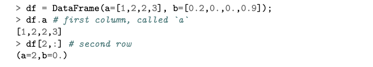 针对这一问题的一种解决方案是围绕单一数据结构进行集中化:即数据框(data frame)。数据框是一种面向列的数据表;与矩阵不同,其各列可具有不同数据类型。Python 生态系统中广受欢迎的 pandas 包[16]即属此类;R 语言内置了 data.frame 类型[20]及其变体 tibble[18];在 Julia 中,许多不同包实现了 Tables.jl 的通用接口,这在一定程度上改善了互操作性。