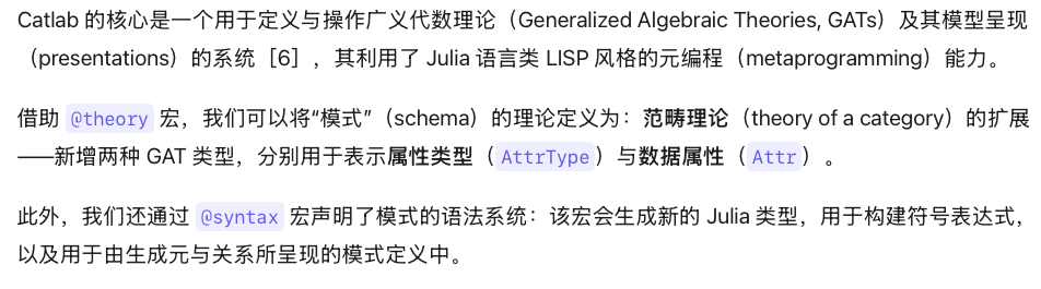 另一方面,我们的定义比 Spivak 与 Wisnesky 的定义[28]略为丰富:我们引入了属性类型(attribute type)的概念,而非将每个属性视为拥有各自独立的数据类型。这一补充在我们的实现中十分便利——属性类型直接对应生成的 Julia 数据类型中的类型参数(参见第 5 节)。