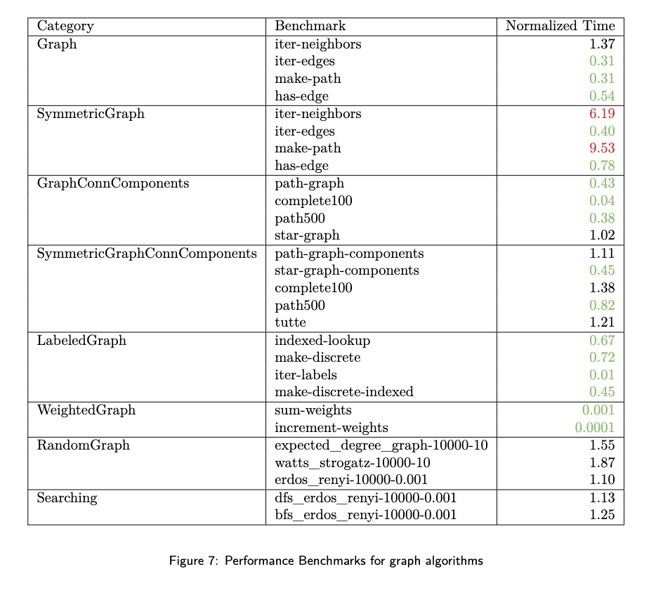 基准测试结果如图 7 所示,其性能已按 Julia 当前最优水平(LightGraphs/MetaGraphs)的时间归一化。用于生成这些基准测试的代码可在 GitHub 上获取。其中,绿色标记的测试结果优于当前最优水平,红色标记的测试结果则比当前最优水平慢两倍以上。在“Graph”和“SymmetricGraph”测试中,我们分别针对有向图与无向图,评测了判断边是否存在、遍历所有边、遍历顶点邻接点以及构建路径图的操作。遗憾的是,我们的无向图数据结构本质上劣于“无向图”数据结构,因此我们无法期望在无向图基准测试中达到同等速度。在“GraphConnComponents”和“SymmetricGraphConnComponents”测试中,我们计算了路径图、完全图、星形图及 Tutte 图的连通分量。在“WeightedGraph”和“LabeledGraph”测试中,我们分别修改并遍历带权图与带标签图的权重和标签。最后,在“RandomGraph”测试中,我们构建具有不同分布的随机图;而在“Searching”测试中,我们遍历此前生成的随机图。