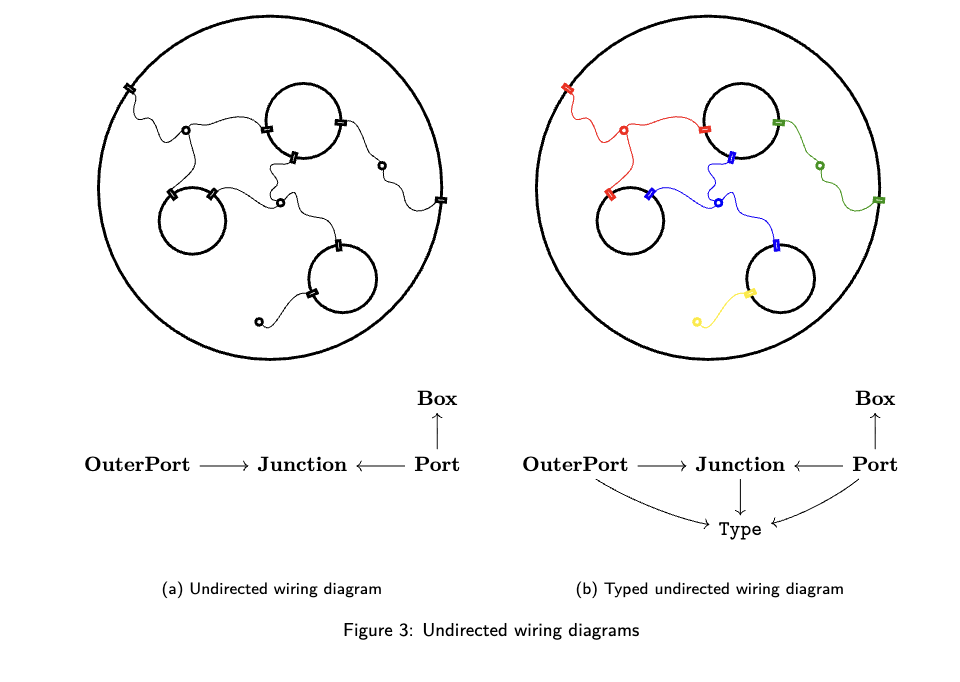 2.3 超越图:接线图及其他类图结构 在计算机科学中,常出现与图类似、但具备额外或不同结构的对象。若为每种图的变体都手工定制数据结构,将导致软件复杂性呈爆炸式增长;然而,若缺乏定制数据结构,又无法高效利用其额外的数学结构。本节将表明,众多类图结构均可统一于 acset 这一概念之下,因而可通过统一、通用的软件接口进行操作。