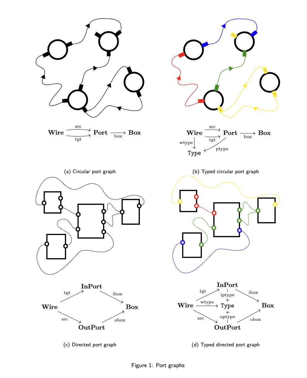 示例 1:图 1 展示了四种不同类型的带端口图(port graphs),以及它们模式(schemas)的生成元。这些端口图在两个维度上有所不同:无类型与有类型,以及圆形(无向)与有向。在有类型端口图中,相连端口与连线的类型必须一致。这一要求由以下等式表达:
