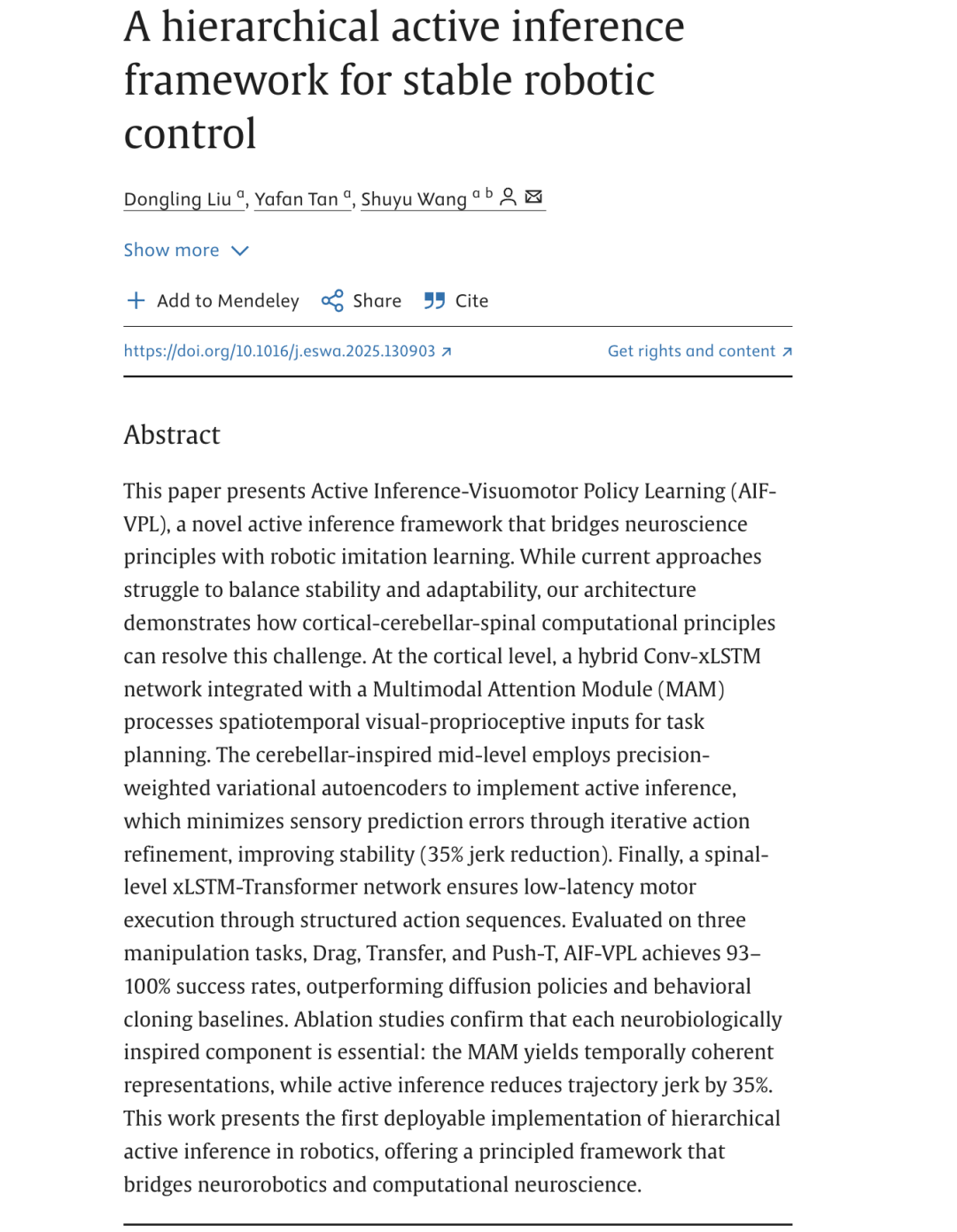 摘要 本文提出“主动推理–视觉运动策略学习”(AIF-VPL),一种新颖的主动推理框架,将神经科学原理与机器人模仿学习相融合。当前方法难以兼顾稳定性与适应性,而本架构展示了皮层–小脑–脊髓层级计算原理如何解决这一挑战:在皮层层面,混合Conv-xLSTM网络结合多模态注意力模块(MAM),处理时空视觉–本体感觉输入以进行任务规划;受小脑启发的中层采用精度加权变分自编码器(VAE)实现主动推理,通过迭代动作优化最小化感觉预测误差,显著提升运动稳定性(急动度降低35%);脊髓层面则由xLSTM–Transformer网络实现低延迟、结构化的动作序列执行。在拖拽(Drag)、转移(Transfer)与推–T(Push-T)三项操作任务上评估表明,AIF-VPL达成93–100%成功率,优于扩散策略与行为克隆基线。消融实验验证了各神经生物学启发组件的必要性:MAM生成时序一致的表征,主动推理机制使轨迹急动度降低35%。本工作首次实现了层级化主动推理在机器人中的可部署应用,为神经机器人学与计算神经科学搭建了原理性桥梁。