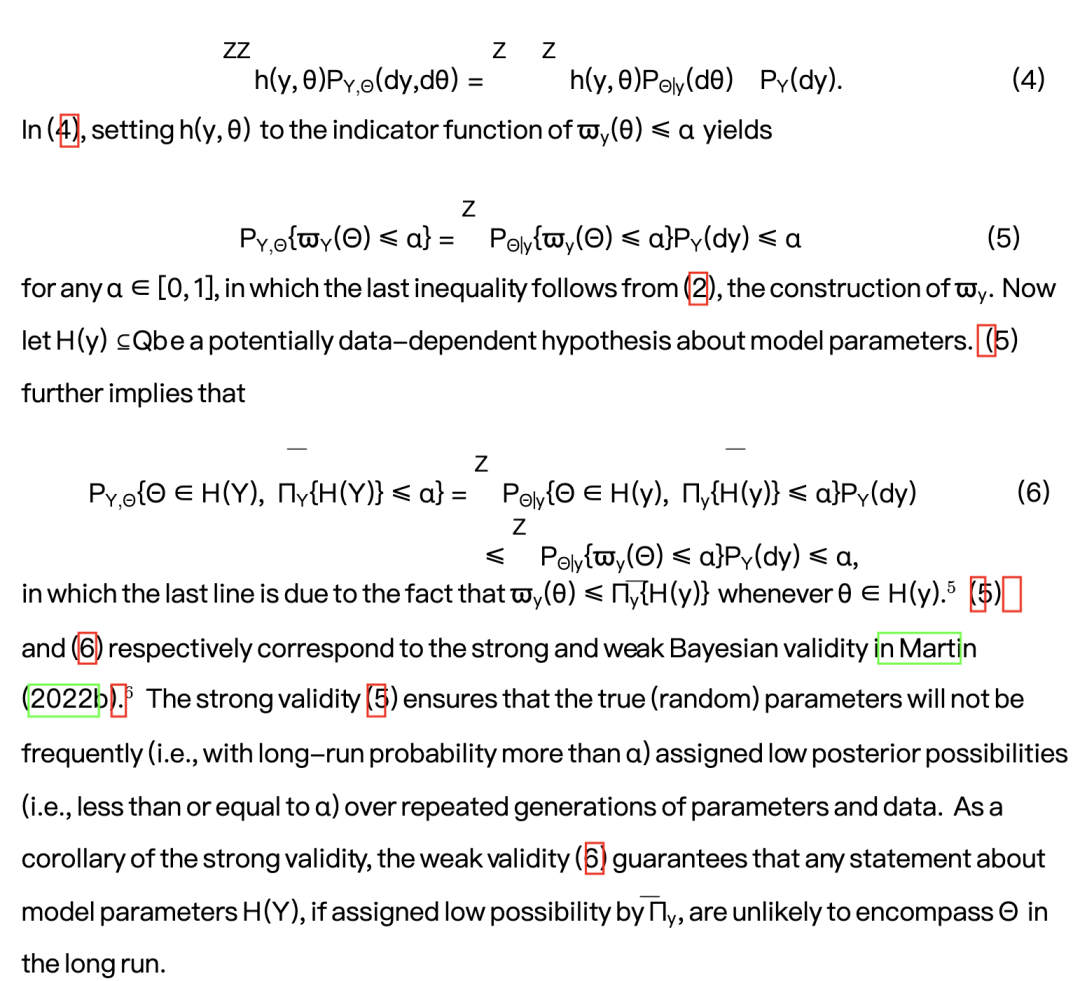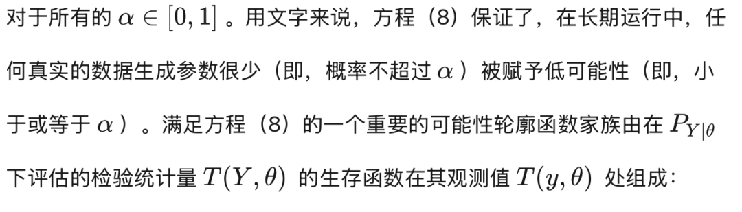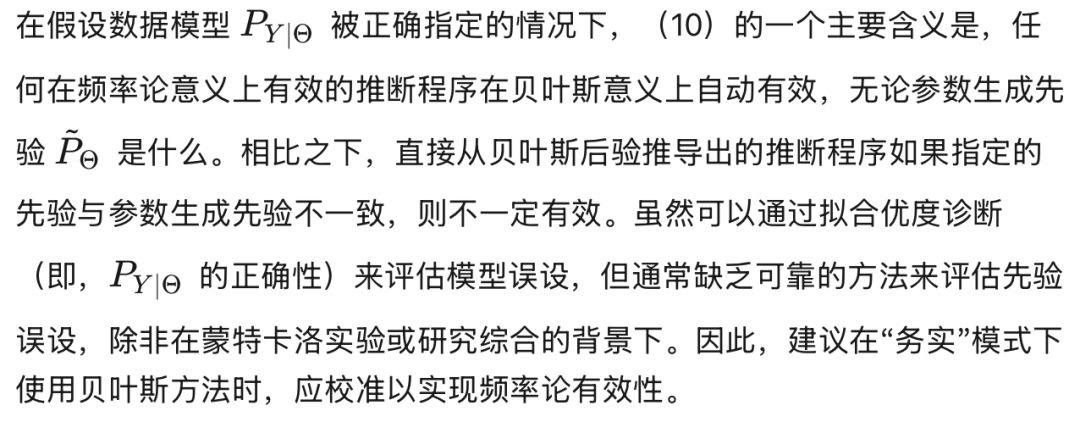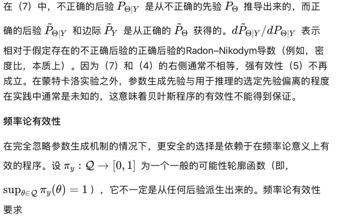 为了使任何统计程序在实践中可靠,最好能确立该程序在各种情境下均能产生可靠的结果。特别是在对模型参数进行推断时,重要的是不应在长期运行中反复将低可能性值赋予频繁发生的事件。越来越多的贝叶斯和频率学派统计学家,尽管对概率代表什么持有不同观点,但仍支持评估推断程序在重复抽样下表现的重要性(例如 Grünwald, 2018;Martin, 2022a, 2022b, 2022c)。接下来,我们将回顾贝叶斯有效性和频率学派有效性的概念。我们强调,基于后验可能性测度的贝叶斯推断,在参数与数据模型均被正确设定的假设下,满足贝叶斯有效性。同时,具有频率学派有效性的程序,在数据模型被正确设定的前提下,对所有先验而言自动满足贝叶斯意义下的有效性。