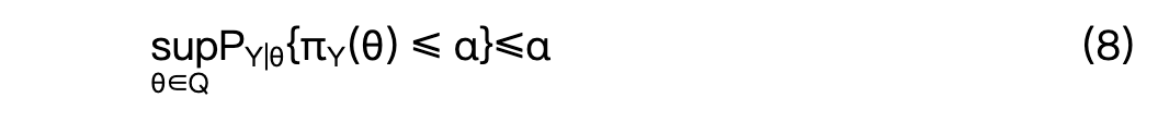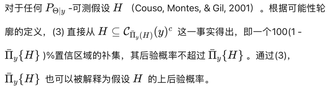 后验可能性是贝叶斯框架内推断的基石。可能性等值线函数 𝔀ᵧ 为所有嵌套可信区域提供了一个简洁的总结:对于任意给定的 α ∈ [0,1],可通过取该等值线的上 α-水平集直接获得一个集合估计量。此外,在贝叶斯检验中,零假设的可信度由其后验可能性保守地量化。例如,若简单假设 H = {θ₀} 的可能性 Π̄ᵧ{H} = 𝔀ᵧ(θ₀) 小于预设的(较小的)α 水平,则该假设被拒绝。