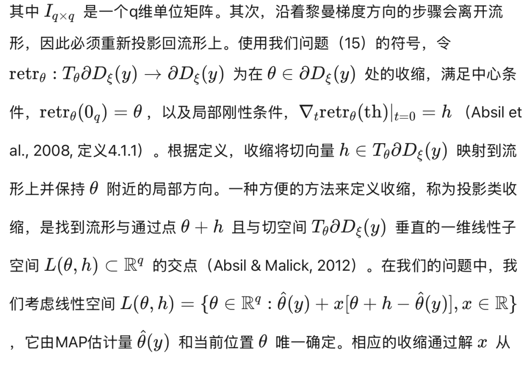 优化问题中,其可行区域形成欧几里得空间的可微分子流形,可以通过黎曼梯度算法有效解决(Absil et al. 2008;另见Y. Liu 2020, 2021,关于黎曼梯度算法及其在心理测量问题中的应用的可访问介绍)。特别地,黎曼梯度上升算法将欧几里得空间中的常规梯度上升算法推广,具有两个显著区别。首先,最陡上升方向只能在当前迭代处局部定义,通过黎曼梯度获得,这是通过将目标函数的周围梯度投影到子流形的切空间来实现的。对于我们的问题(15),