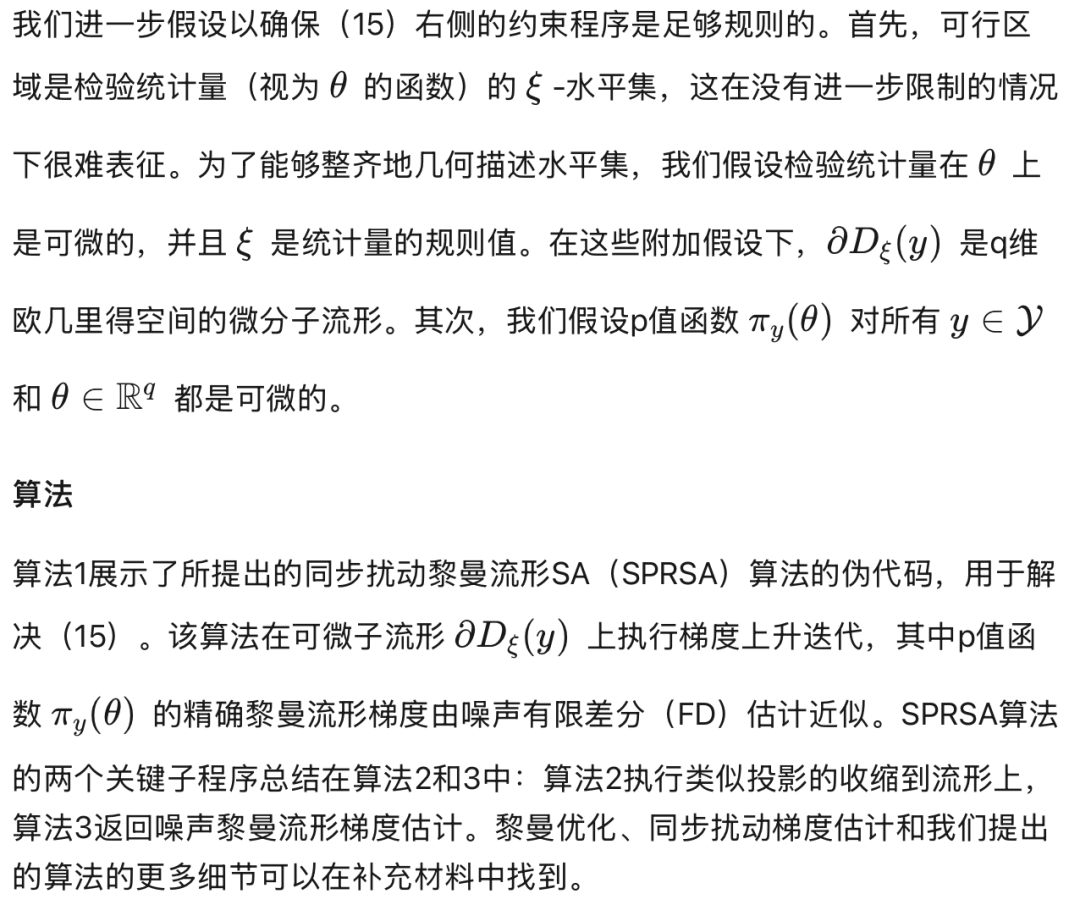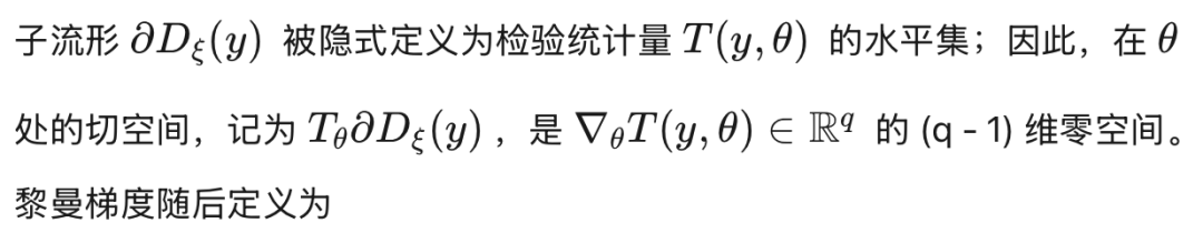 在应用标准黎曼梯度算法求解[15]时,另一个挑战来自于对p值函数的精确梯度∇θπy(θ)的评估。这是因为p值函数是一个积分,其定义域通过检验统计量依赖于θ。尽管有时可以通过广义莱布尼茨法则(也称为雷诺兹输运定理;参见例如Flanders, 1973; Reddiger & Poirier, 2023)获得解析导数,但一般而言,计算这些导数是困难的,因为检验统计量本身的计算可能涉及优化。一种简单的尝试是用有限差分(FD)估计来近似梯度的第r个元素(r = 1, ..., q),记为∇θrπy(θ):