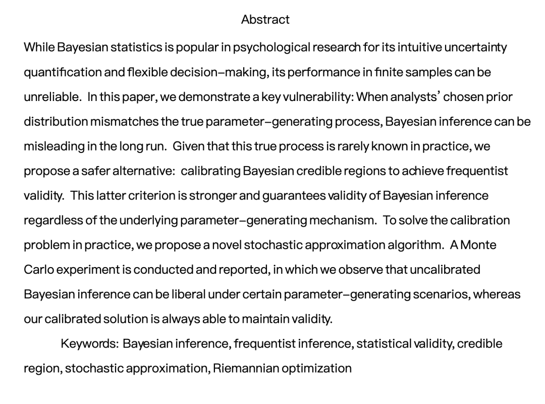 摘要 尽管贝叶斯统计因其直观的不确定性量化和灵活的决策能力而在心理学研究中广受欢迎,但其在有限样本中的表现可能不可靠。本文揭示了一个关键弱点:当研究者所选的先验分布与真实参数生成过程不匹配时,贝叶斯推断在长期运行中可能产生误导。鉴于真实过程在实践中通常未知,我们提出一种更安全的替代方案:对贝叶斯可信区域进行校准,以实现频率学派的有效性。这一标准更强,能保证无论底层参数生成机制如何,贝叶斯推断均有效。为在实践中解决校准问题,我们提出了一种新颖的随机逼近算法。我们开展并报告了一项蒙特卡洛实验,结果表明,在某些参数生成情形下,未经校准的贝叶斯推断可能过于宽松(liberal),而我们的校准方案始终能保持有效性。