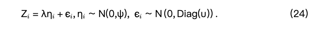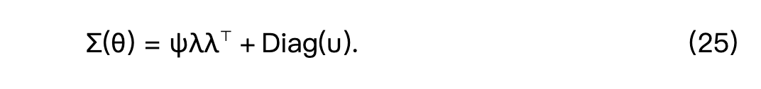 在(24)中,λ = (λ₁, ..., λₘ)ᵀ ∈ ℝᵐ 是因子载荷向量,ψ ≥ 0 表示公共因子方差,u = (u₁, ..., uₘ)ᵀ ∈ ℝ₊ᵐ 收集了唯一因子方差参数。为了识别该模型,要求公共因子 ηᵢ ∈ ℝ 与唯一因子 εᵢ ∈ ℝᵐ 相互独立,并且第一个因子载荷 λ₁ 固定为1。以下协方差矩阵由公共因子模型推导得出: