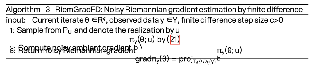 为解决这些问题,我们提出一种SPRSA算法,它结合了针对所有 q 个参数的同时扰动有限差分法(解决了问题(a)),以及沿黎曼梯度迭代 k = 0, 1, ... 进行衰减的有限差分步长序列 {ck}(解决了问题(b))。设 Y = g(U, θ) 为一个数据生成算法,其中随机分量 U ~ PU,且分布 PU 完全已知。在第 k 次迭代时,∇θπy(θ(k)) 的同时扰动有限差分估计量定义为