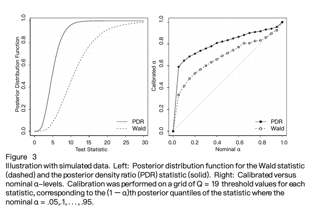 我们以在 m = 5 且参数按情景1生成条件下生成的最后一组数据为例。基于保留的MCMC抽样,Wald统计量和PDR统计量的估计后验密度显示在图3左侧面板中。对于每个统计量,令 Q = 19,ξ₁, ..., ξ₁₉ 为后验分布的 .95, .9, ..., .05 分位数。建议的图形展示呈现在图3右侧面板中。在此数据集中,校准推断对于两种类型的可信区域而言,均比原始后验推断更为保守。更具体地说,对于HPD区域,α 水平调整幅度比椭圆区域更大。